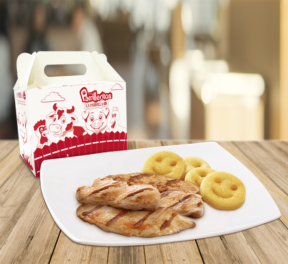 150 gr de pechuga de pollo, jugo de caja, papas a la francesa y dulce con sorpresa