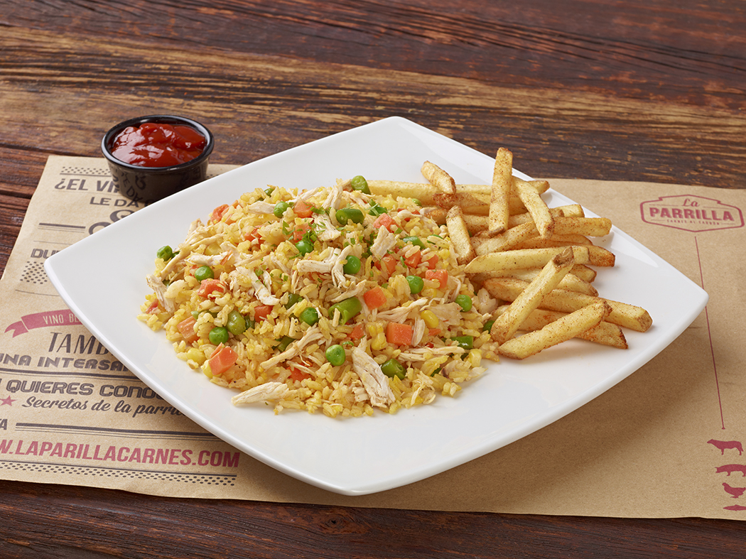 Arroz con pollo acompañado de papa a la francesa, ensalada de lechuga y tomate.