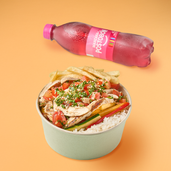 Arroz con pollo acompañado de papa a la francesa y ensalada de tomate y lechuga + gaseosa 400 pet