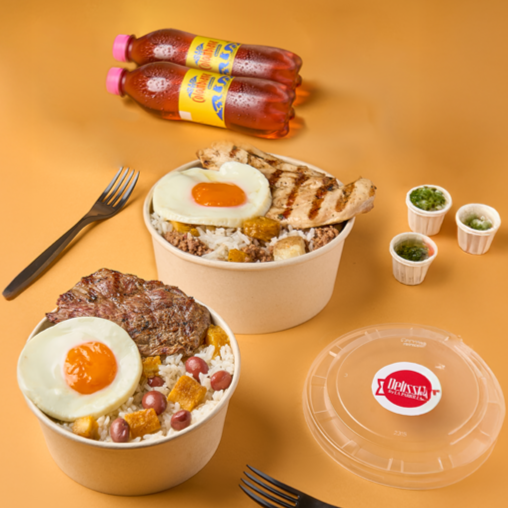 Pechuga de pollo en trozos y chorizo de cerdo, acompañados de papa en cascos, moneditas de plátano y Gaseosa 400 ml.