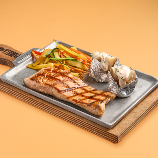 Salmon en filete 275 gr acompañado de papa parrilla y vegetales salteados.