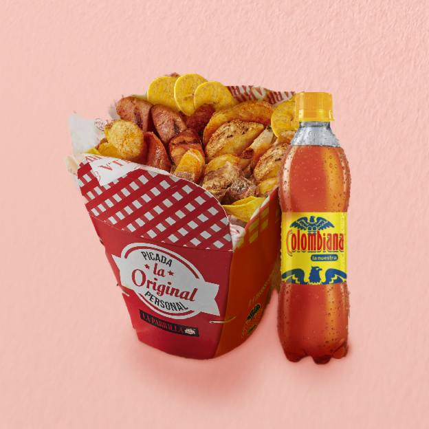 Picada de res, pollo, 2 chorizos, 2 morcillas, platano maduro, arepa boyacense, papas a la francesa y papa salada + de 2 vasos de gaseosa 400 ml