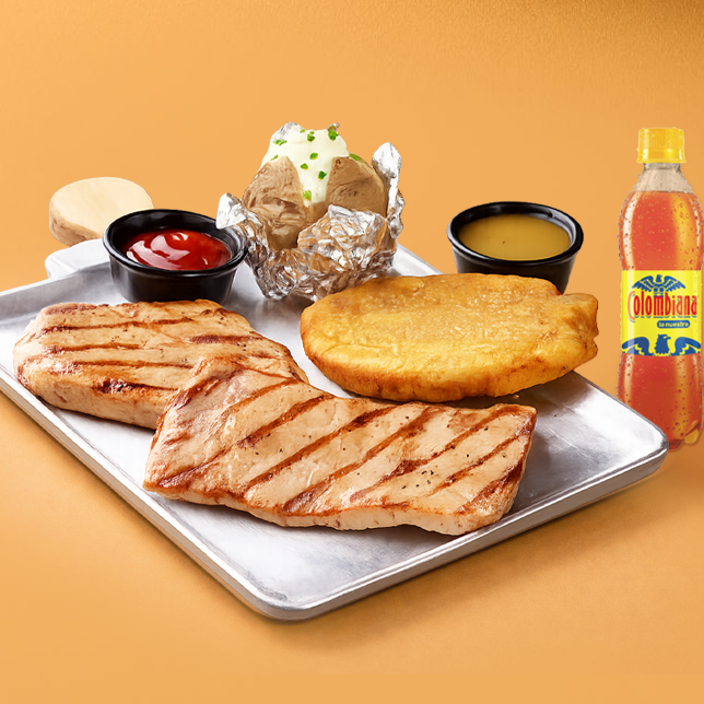 Pechuga de pollo 150 gr, lomo de cerdo 150 gr y 2 acompañamientos a elección + gaseosa pet 400 mL