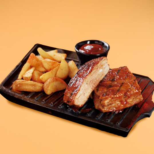 Costillas de cerdo preparadas lentamente a la parrilla y caramelizadas en salsa bbq.