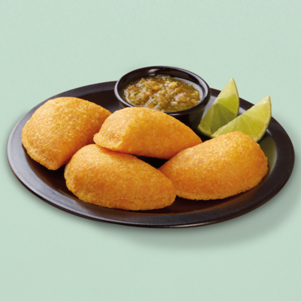 4 empanadas de carne acompañadas de ají y limón.