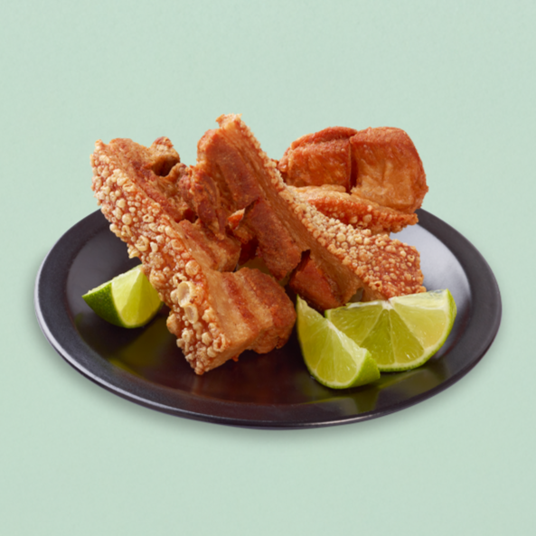 3 chicharrones acompañados de arepita blanca y limón.