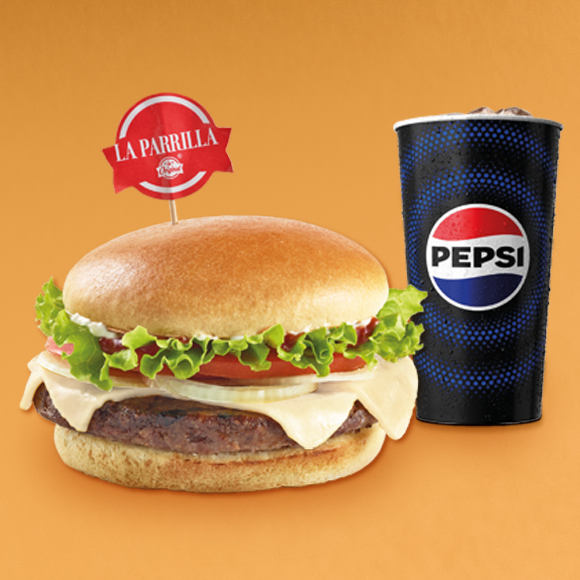 100 gr Carne de res, queso tajado tomate, lechuga y salsas + gaseosa pet 400 mL