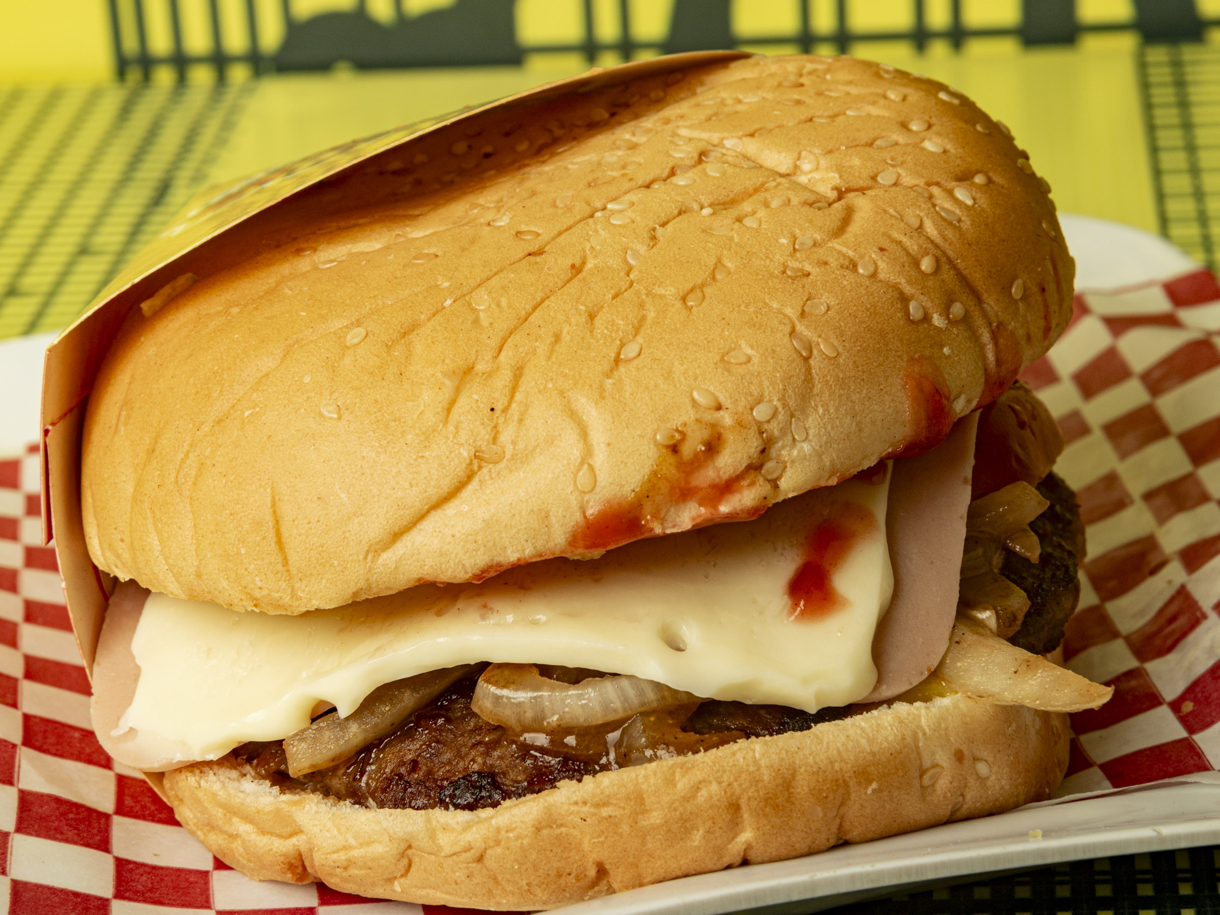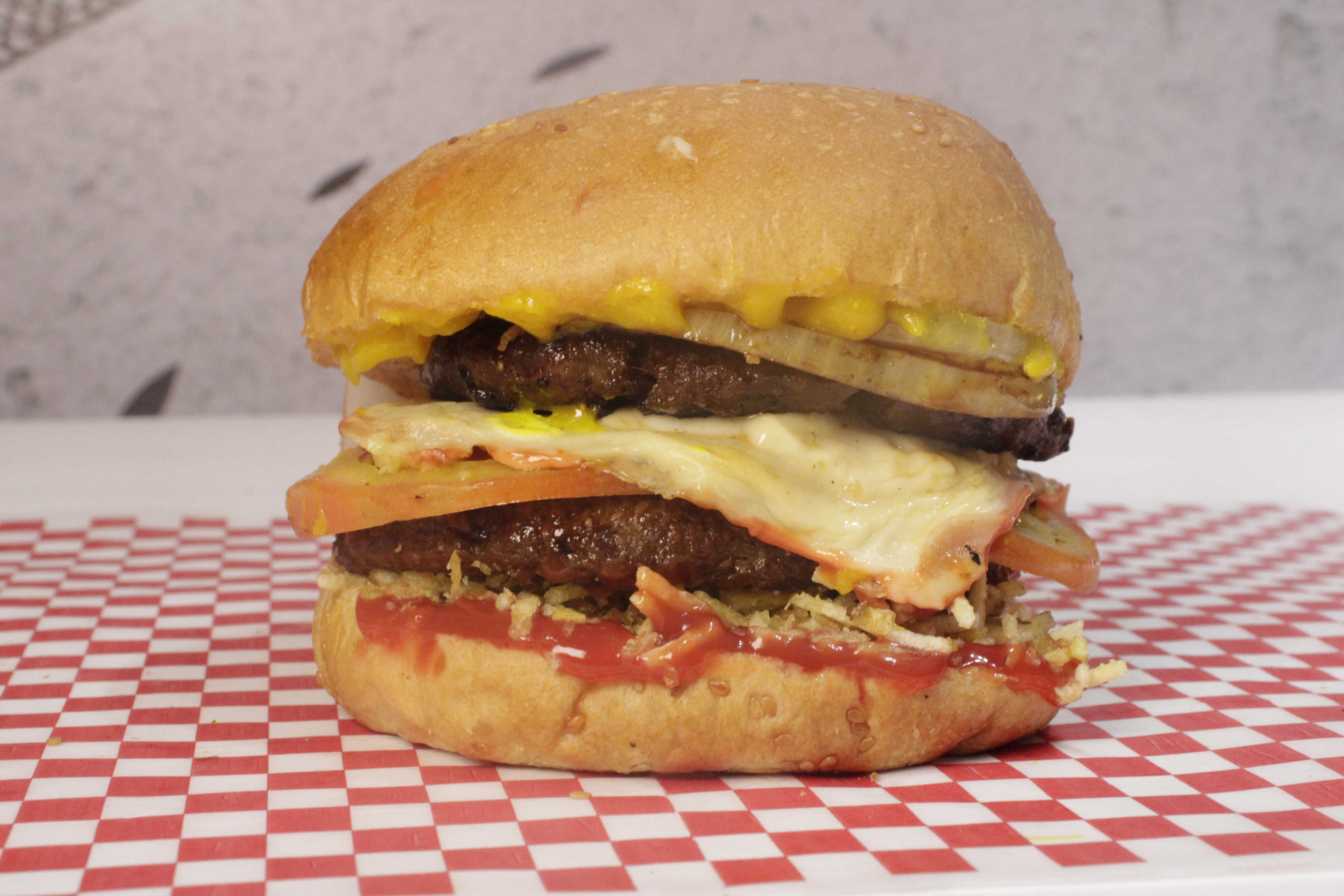 Doble carne 100% de res, cebolla, tomate, jamón, salsas, queso y papa ripio.