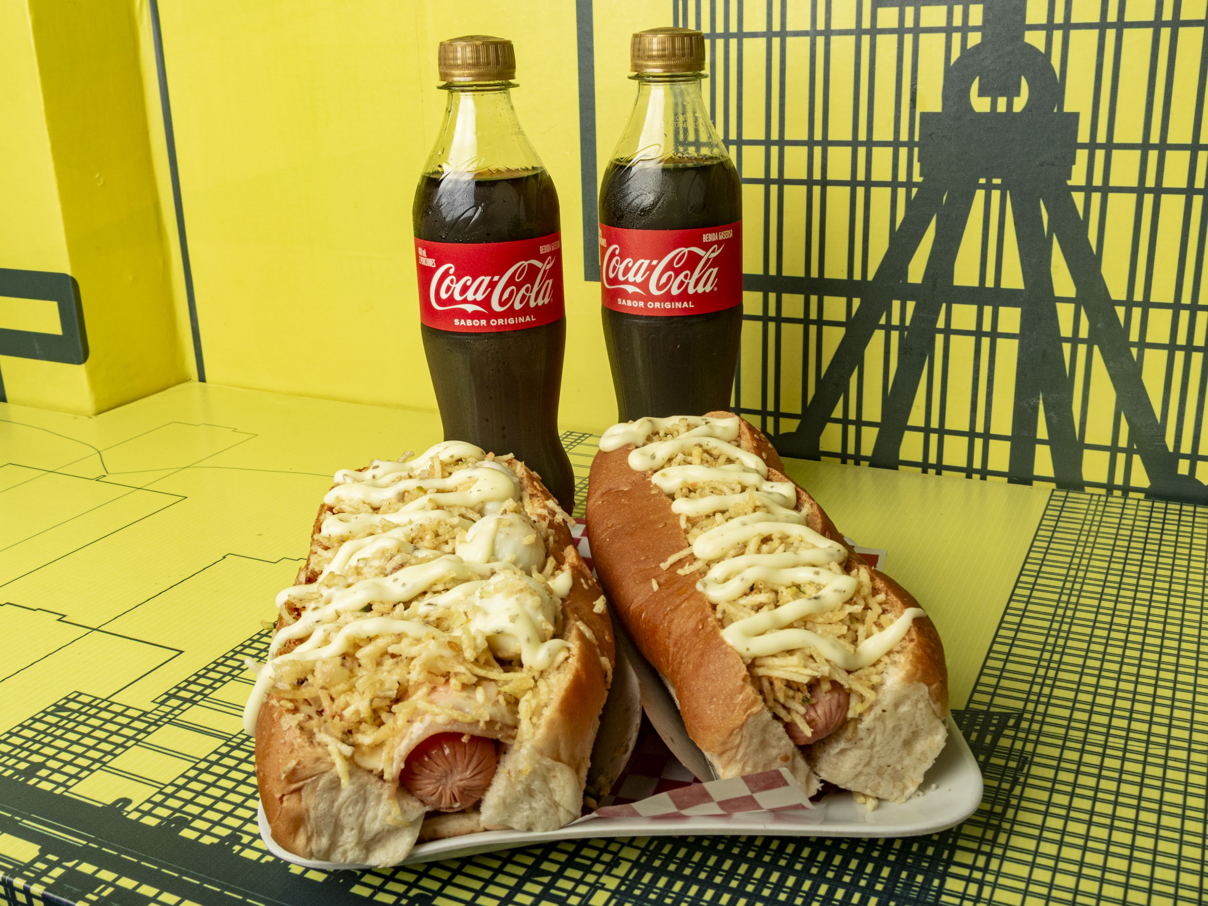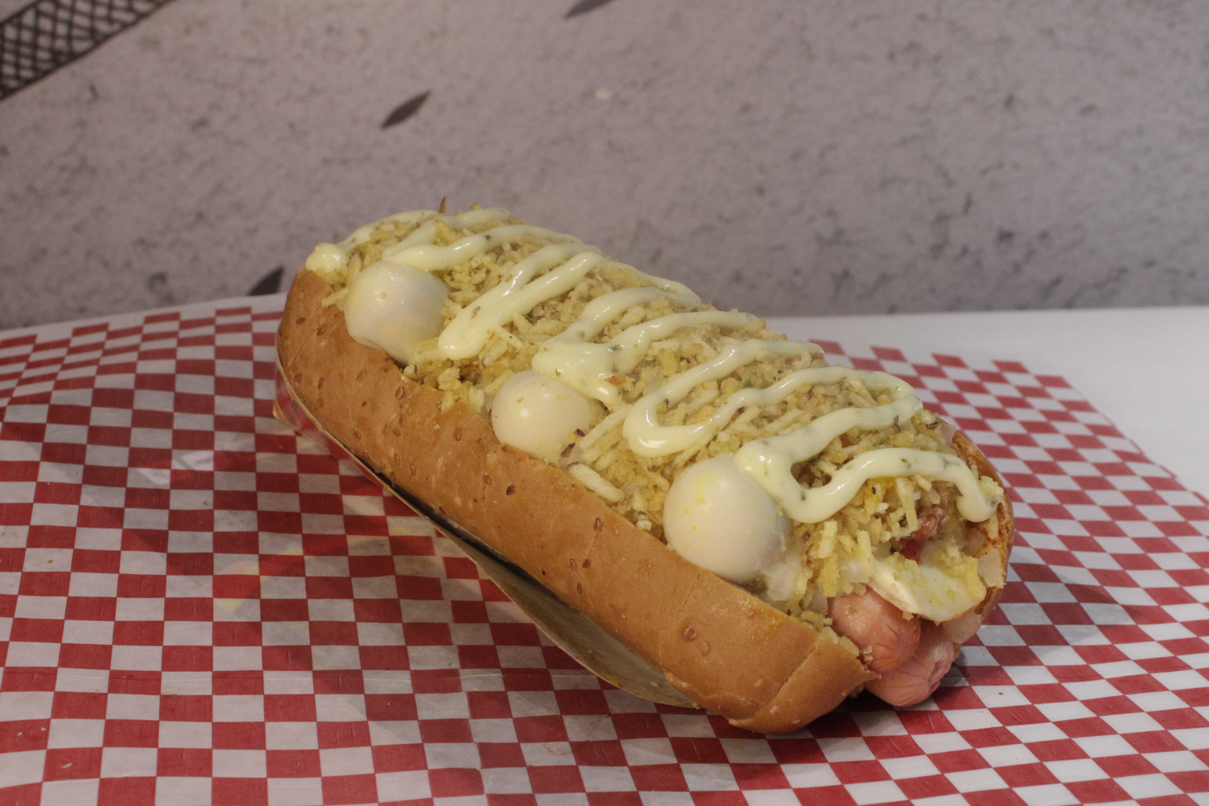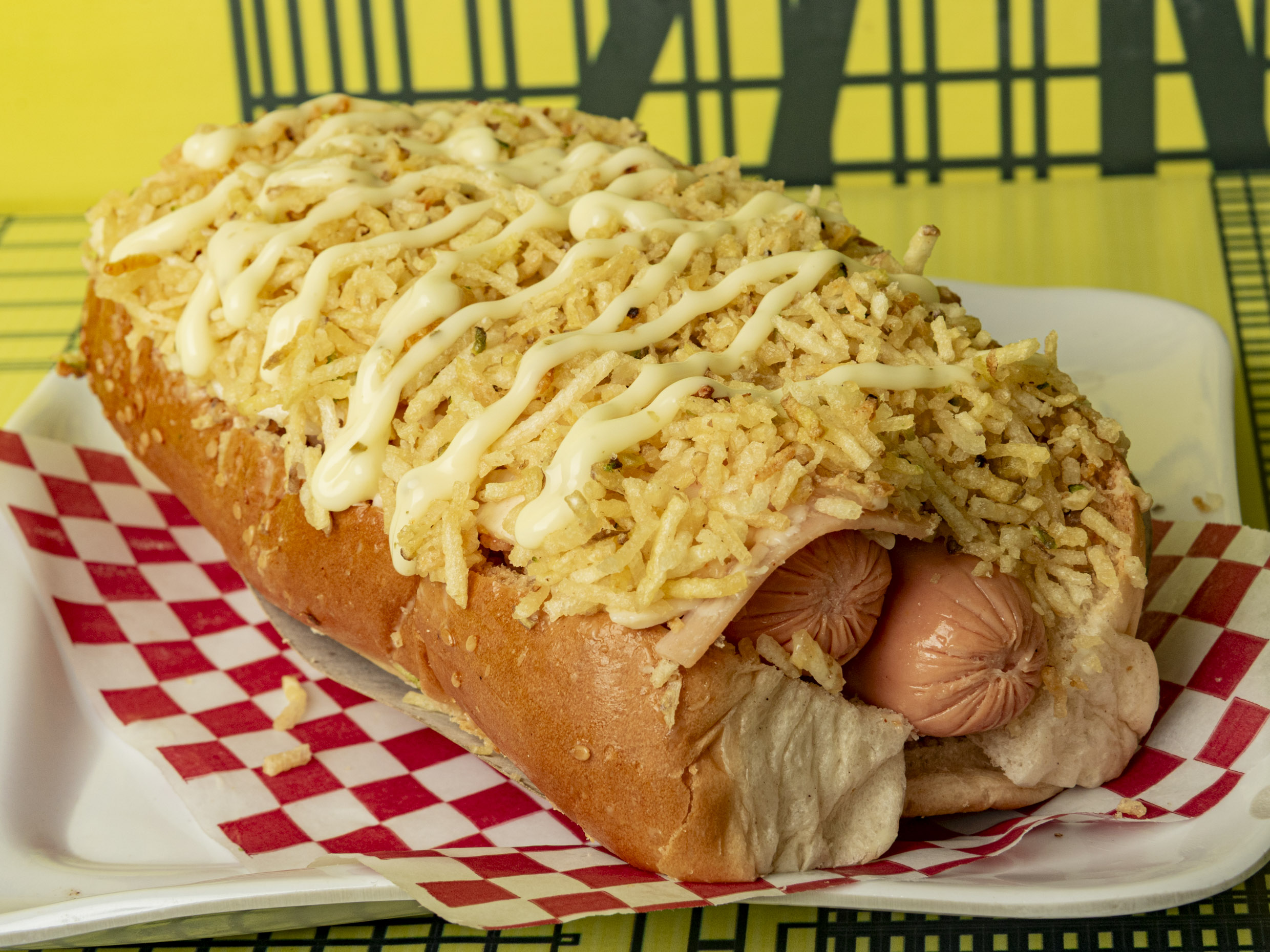 Doble salchicha long Zenú, cebolla, jamón, 3 huevos de codorniz, salsas, queso y papa chip.