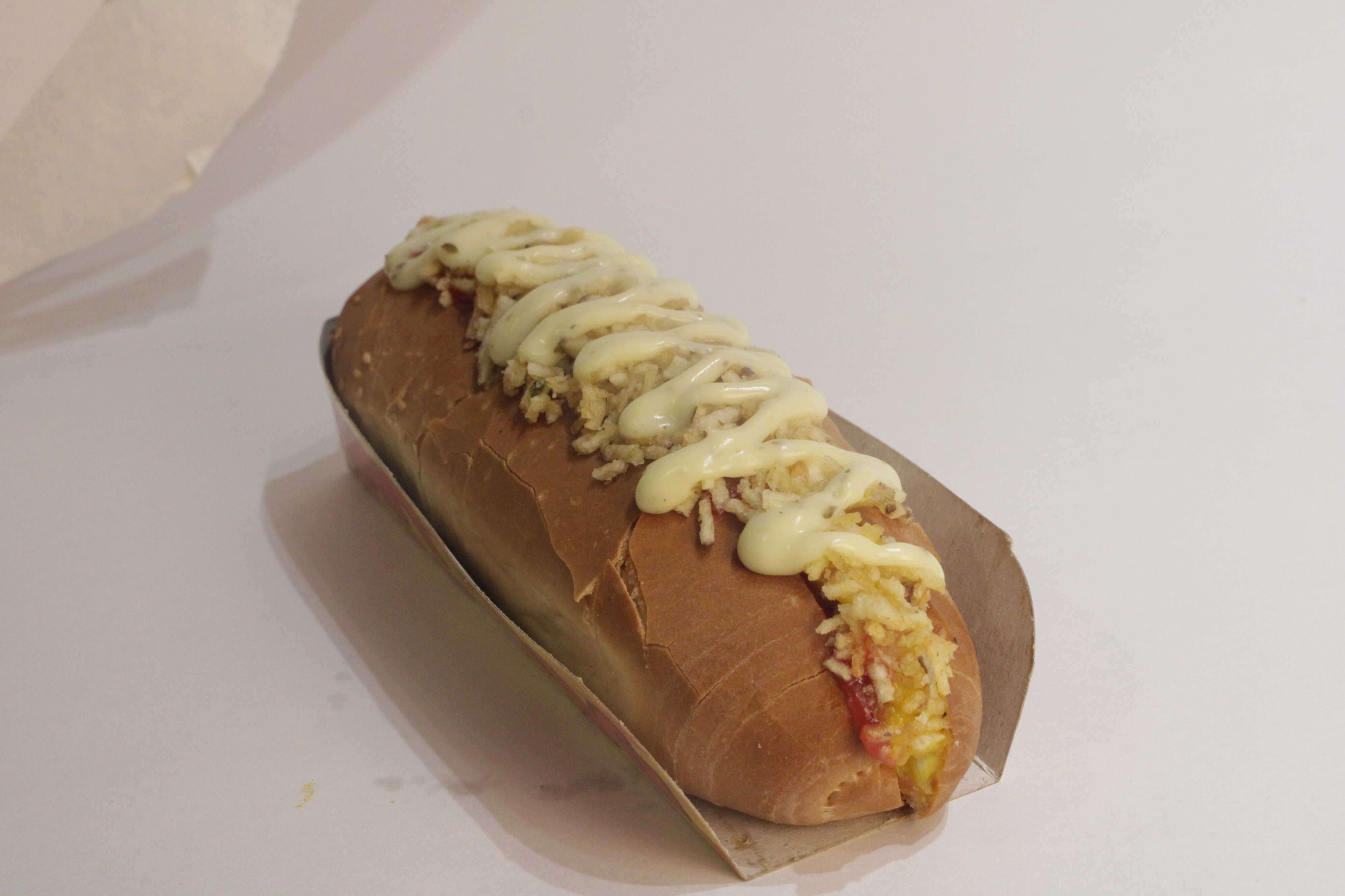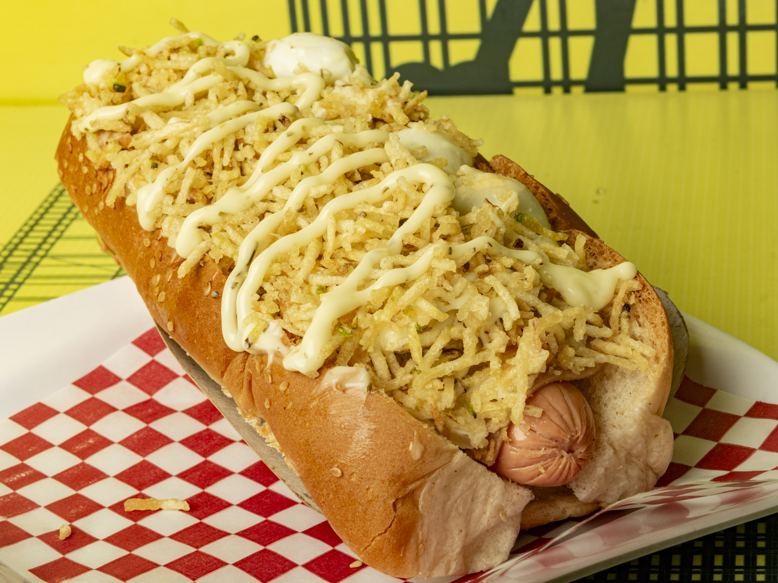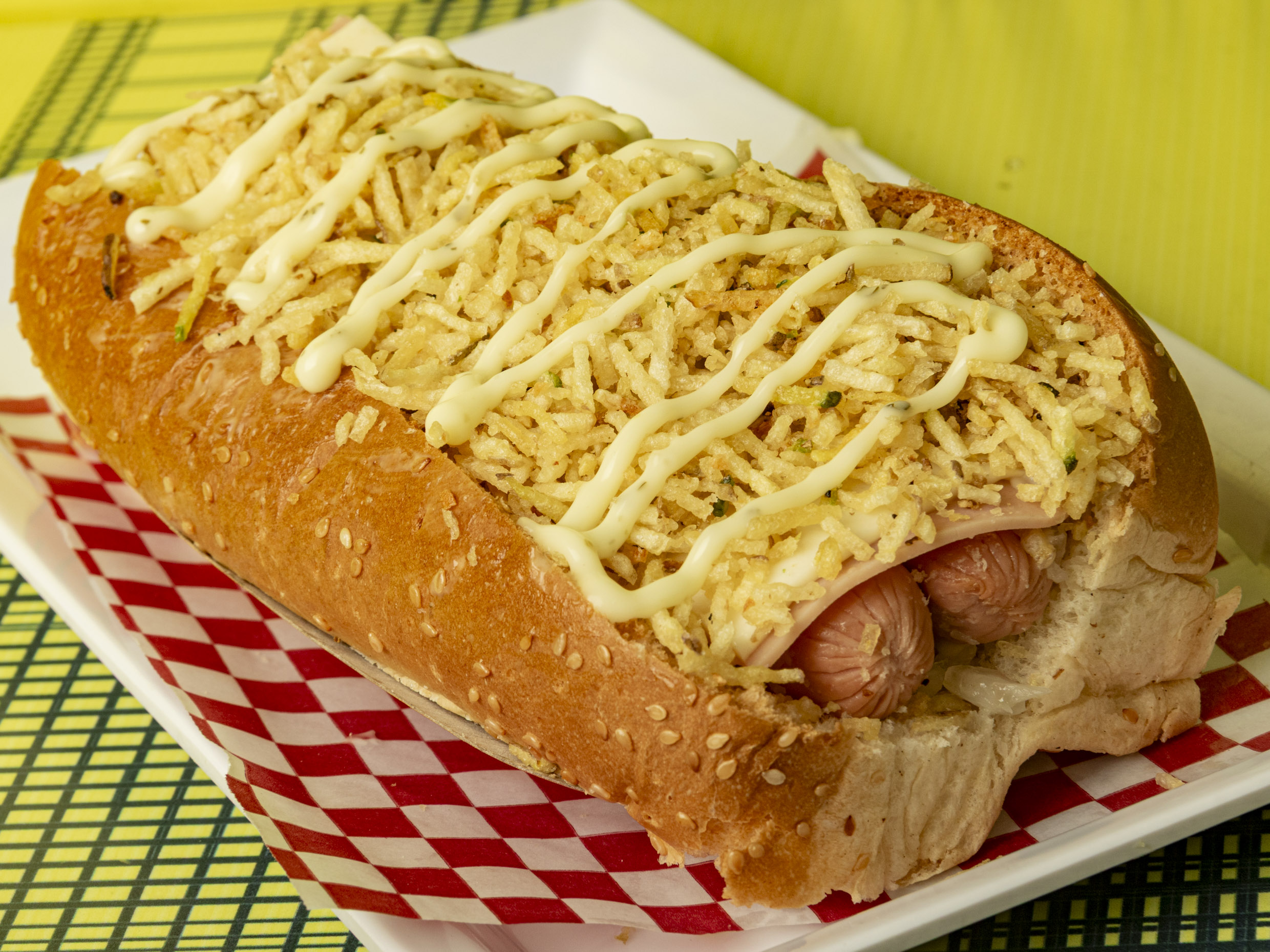 Doble salchicha long Zenú, cebolla, jamón, 3 huevos de codorniz, salsas, queso y papa chip.