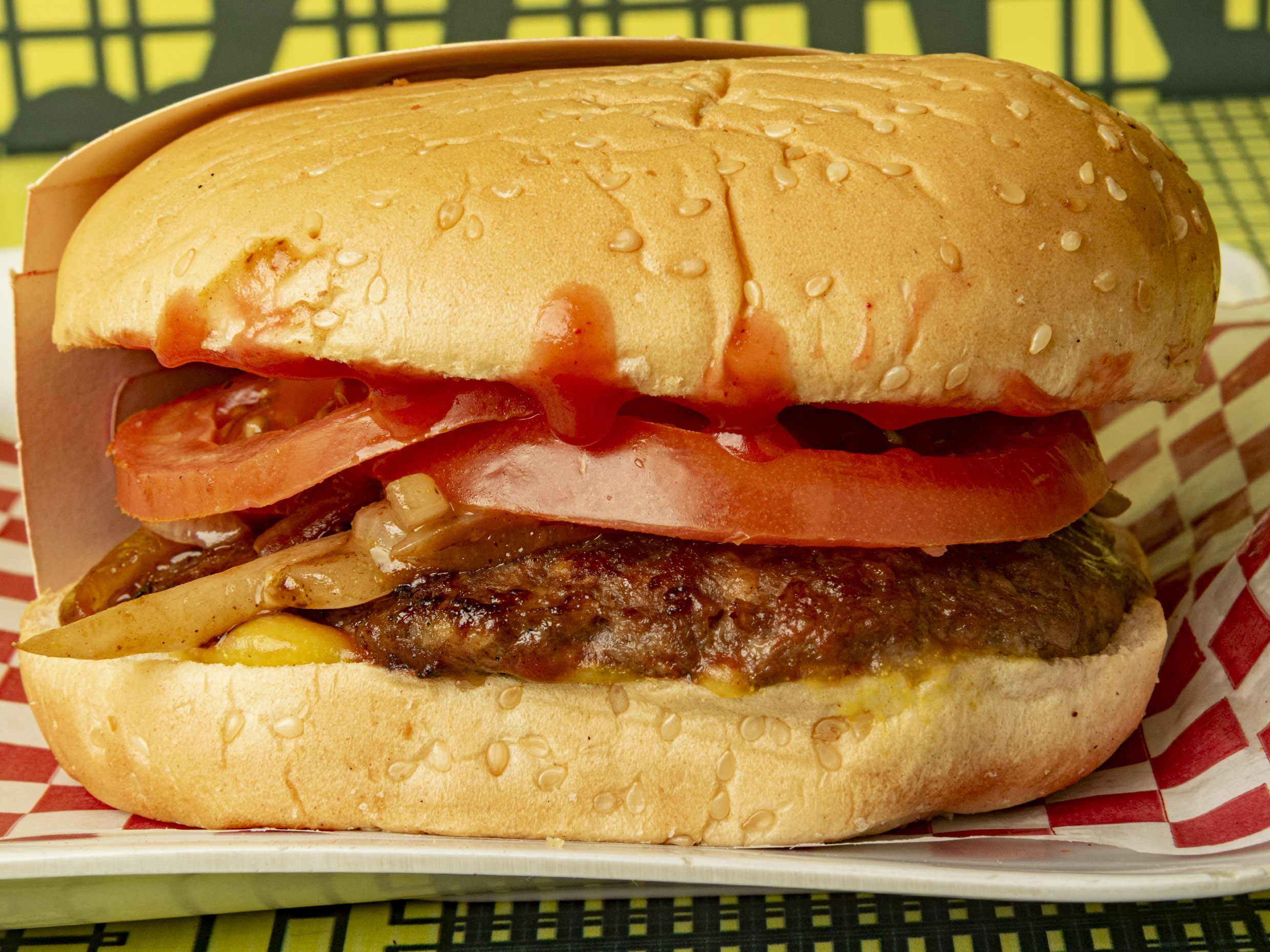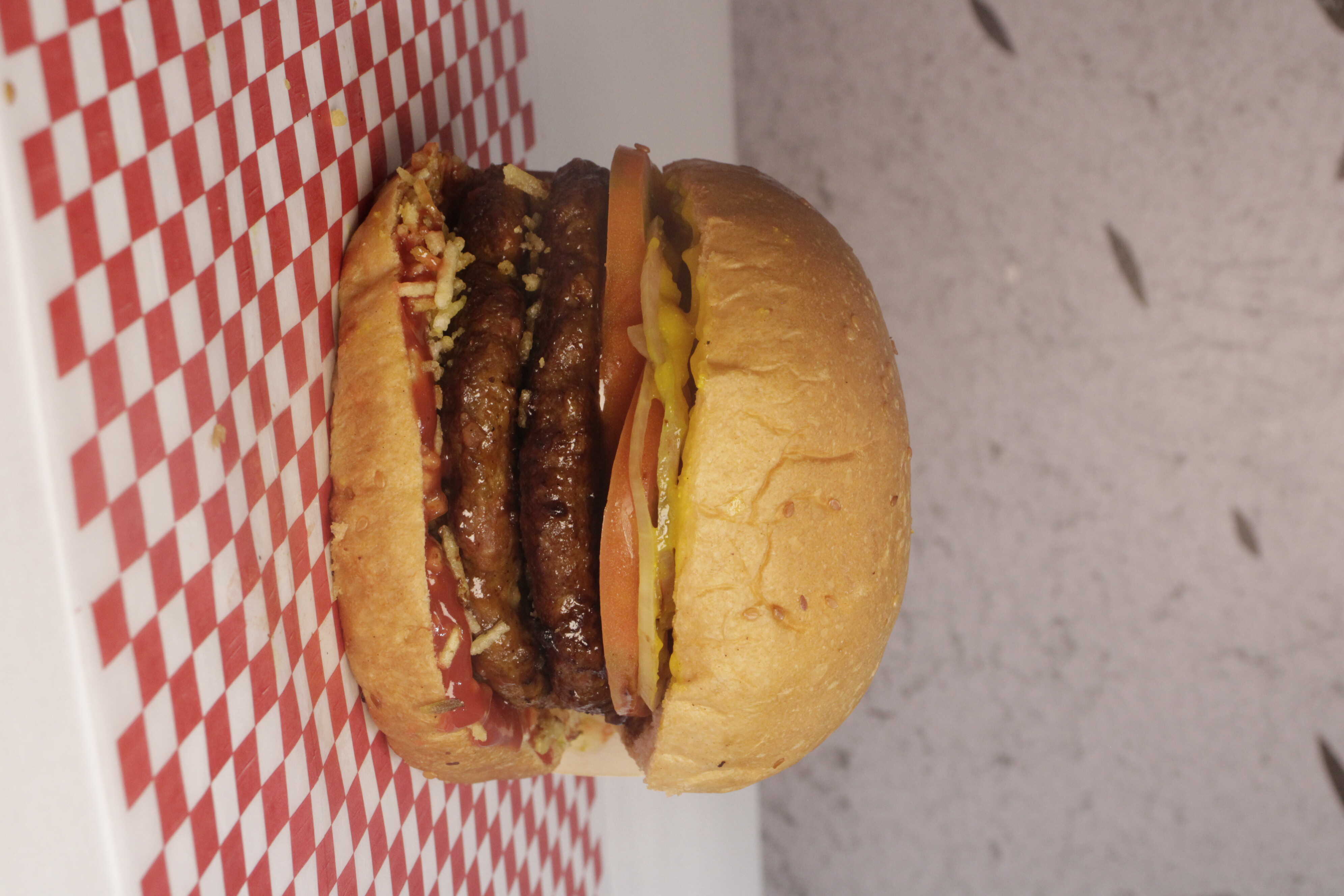 Doble carne 100% de res, cebolla, tomate, salsas, queso y papa ripio.
