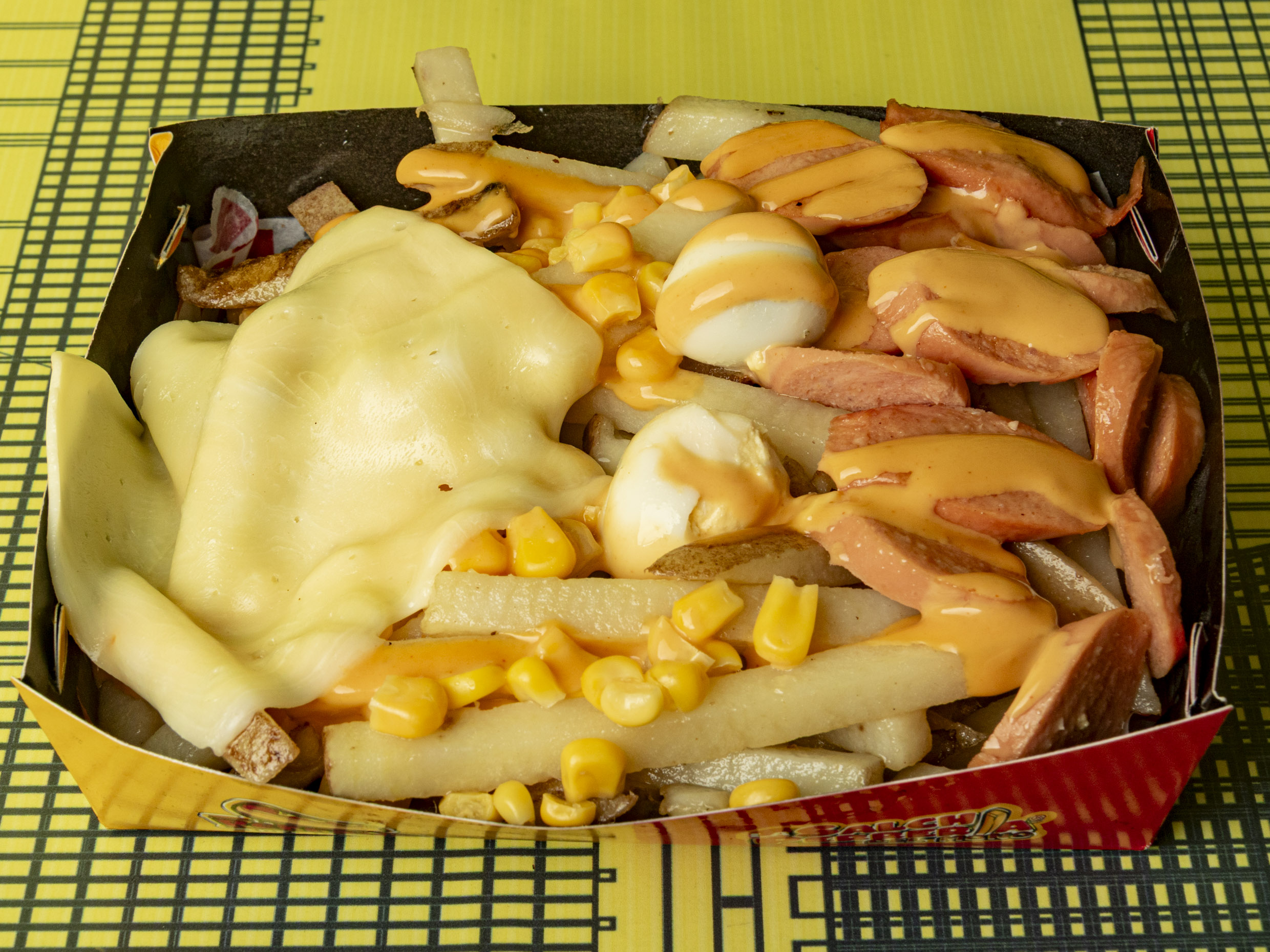 Carne 100% de res, cebolla, tomate, salsas, queso y papa ripio.