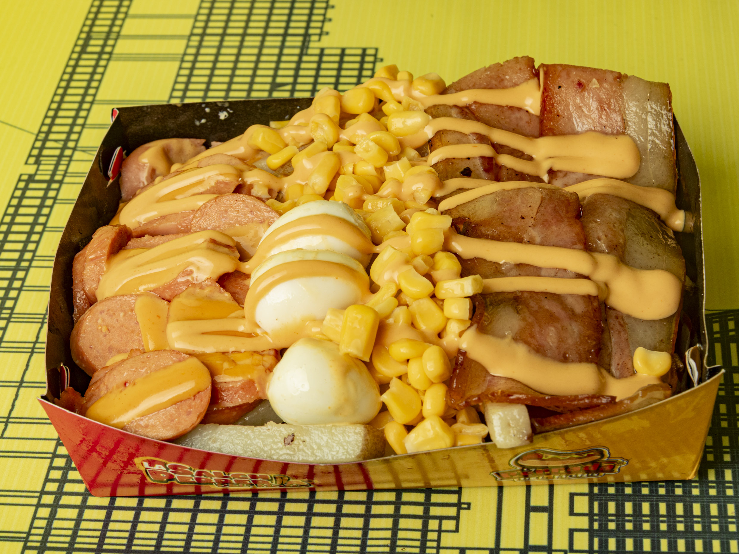 Salchicha americana Zenú, papa, queso, tocineta, 2 huevos de codorniz.