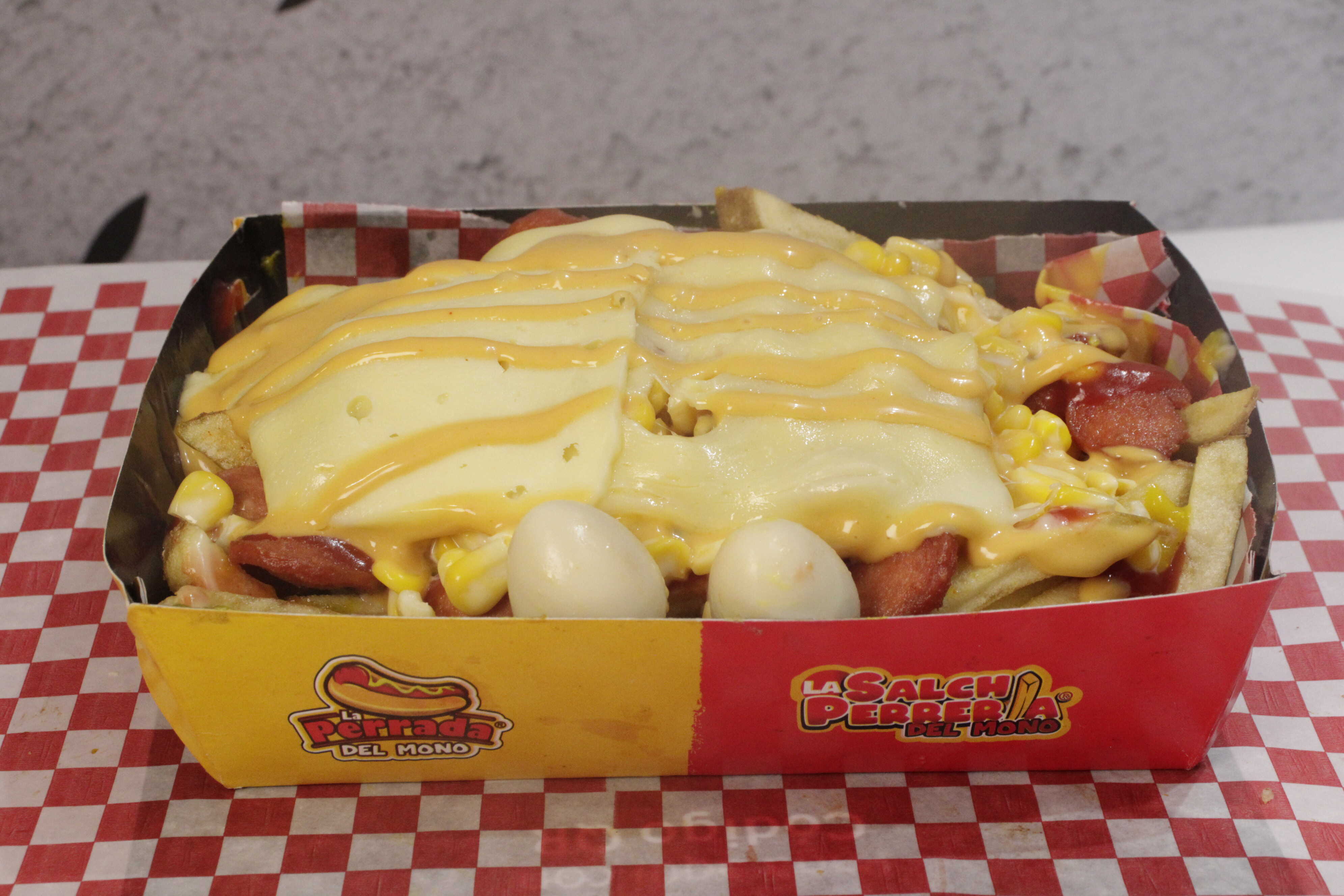 Salchicha tradicional Zenú, cebolla, 3 huevos de codorniz, salsas, queso y papa chip.