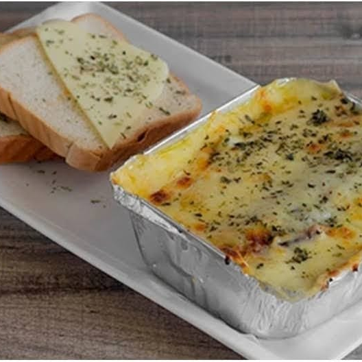 Maíz, queso, champiñón, salsa bechamel, tomate, orégano. Acompañado con pan.
