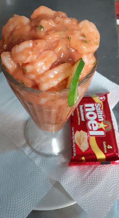 Camarones preparados en salsa rosada, cebolla ,Acompañado con galletas de soda