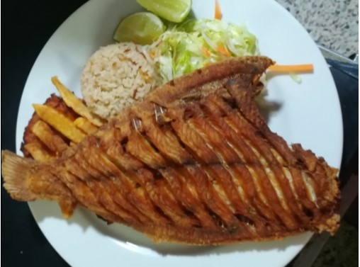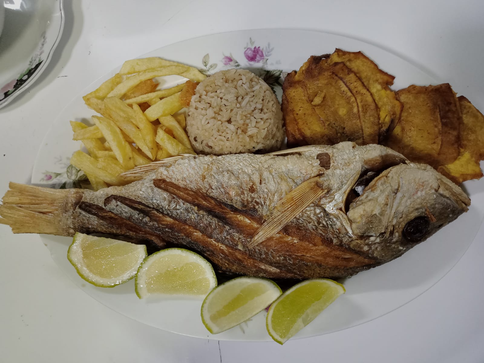 Mojarra Roja Frita de 300gr acompañada de, Papa francesa, patacón, ensalada de tomate y cebolla, sancocho de pescado y arroz a elección.