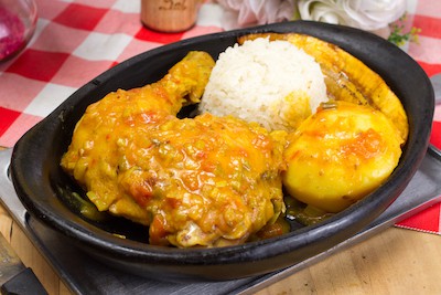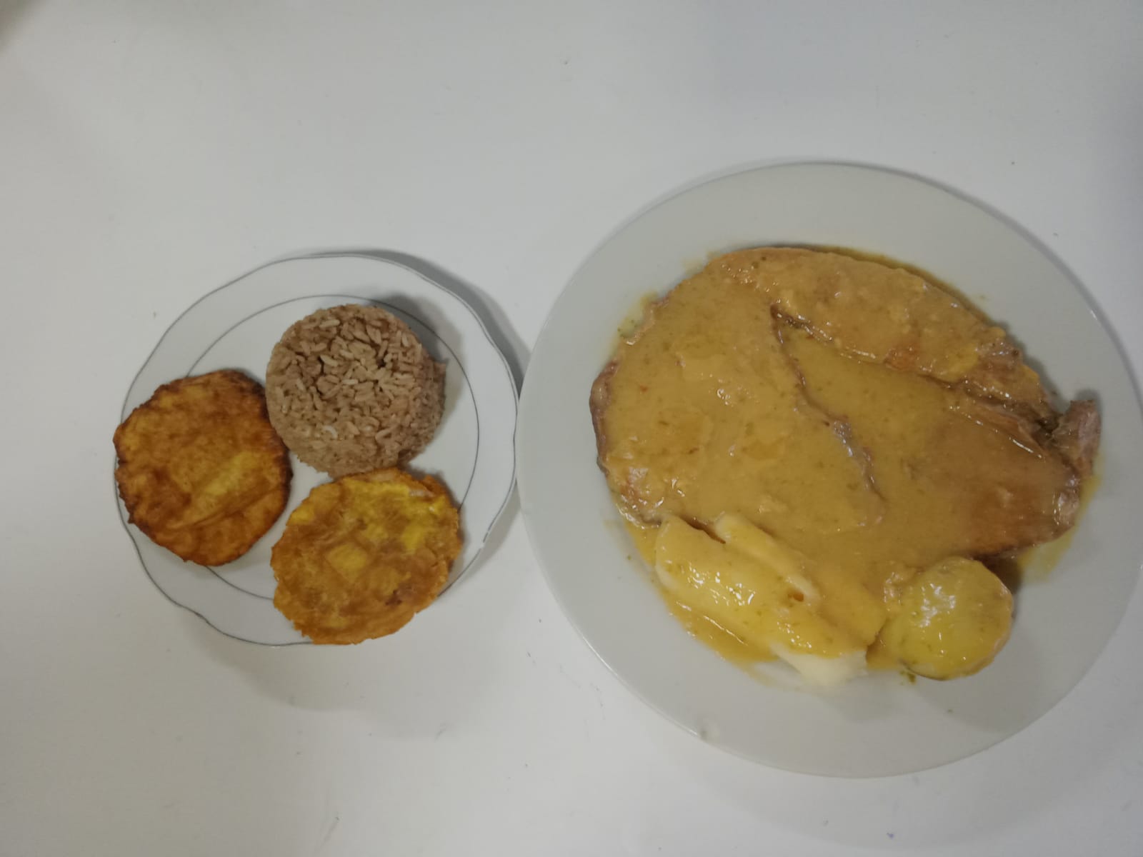 Papa sudads, yuca sudada, patacón, sancocho de pescado y arroz a elección.
