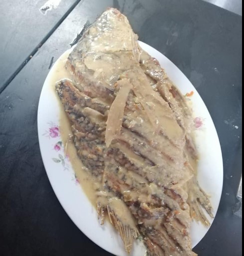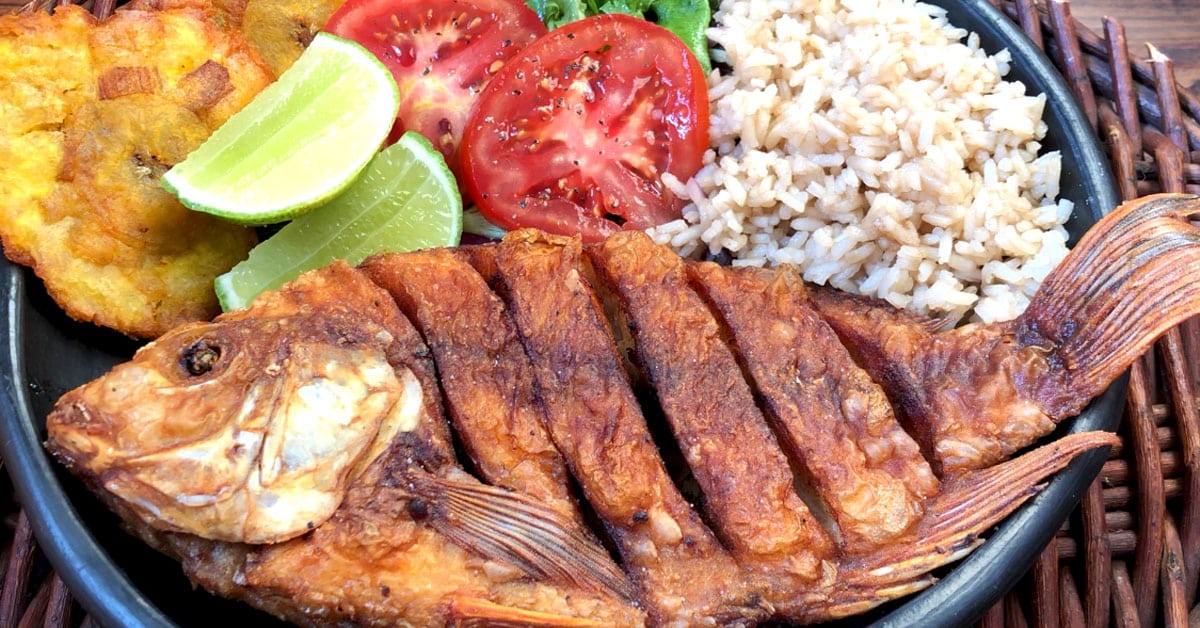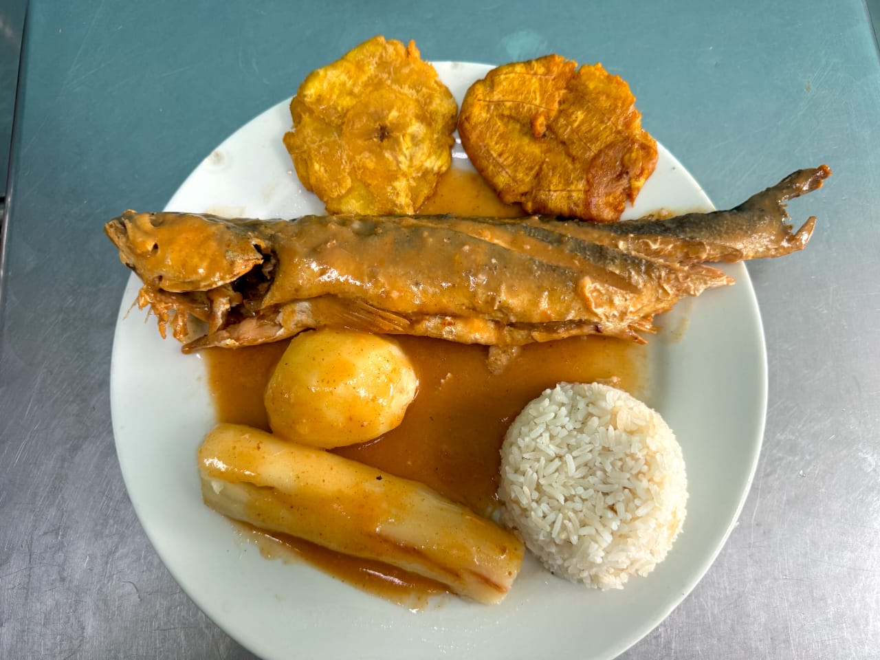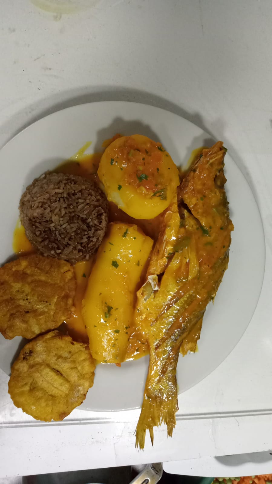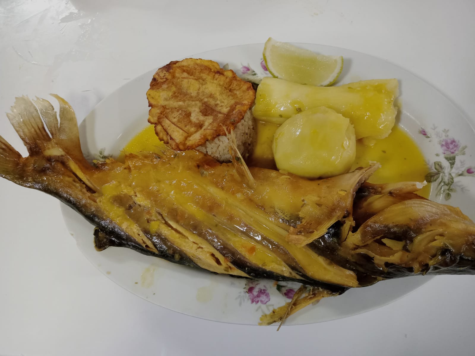 Acompañado de papa y yuca sudada, arroz y patacon, sancocho de pescado