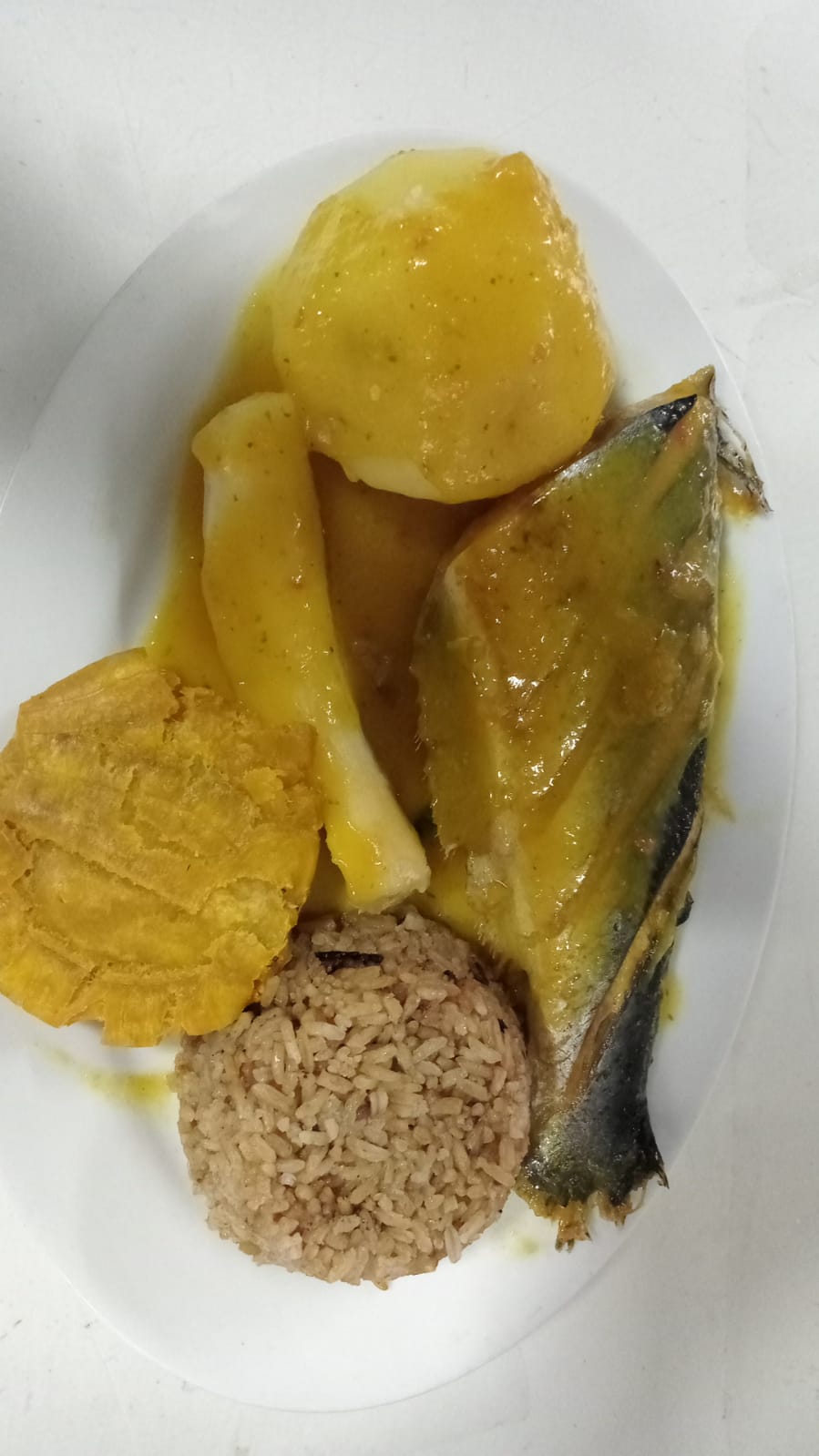 Papa salada, yuca sudada, patacón, sancocho de pescado y arroz a elección.