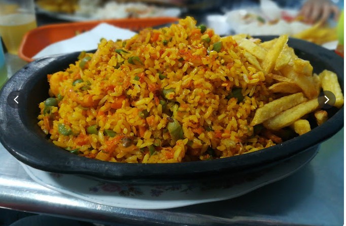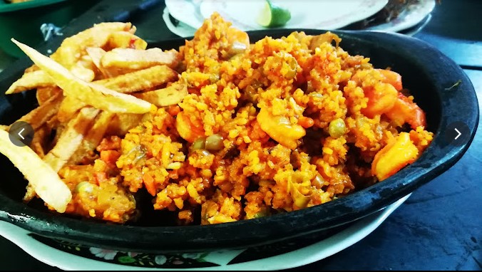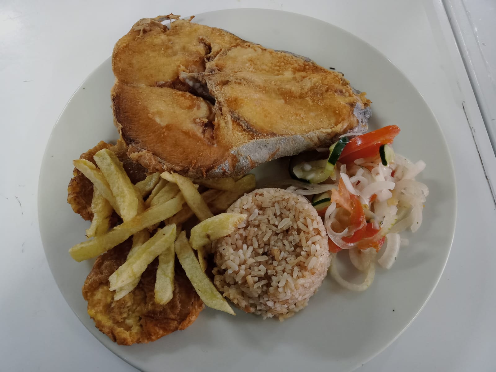 Papa francesa, patacón, ensalada de tomate y cebolla, sancocho de pescado y arroz a elección.