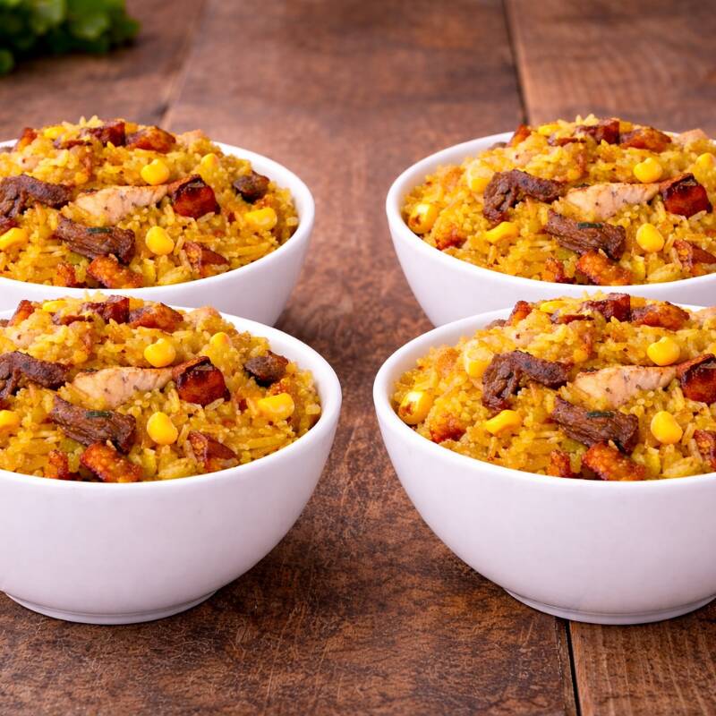 Arroz con trozos de pollo, carne de res, chicharron, platano maduro, maiz.