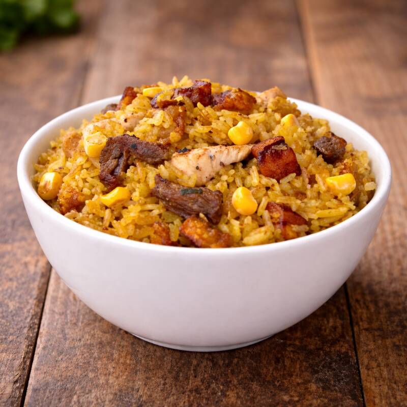 Arroz con trozos de pollo, carne de res, chicharron, platano maduro y maiz.