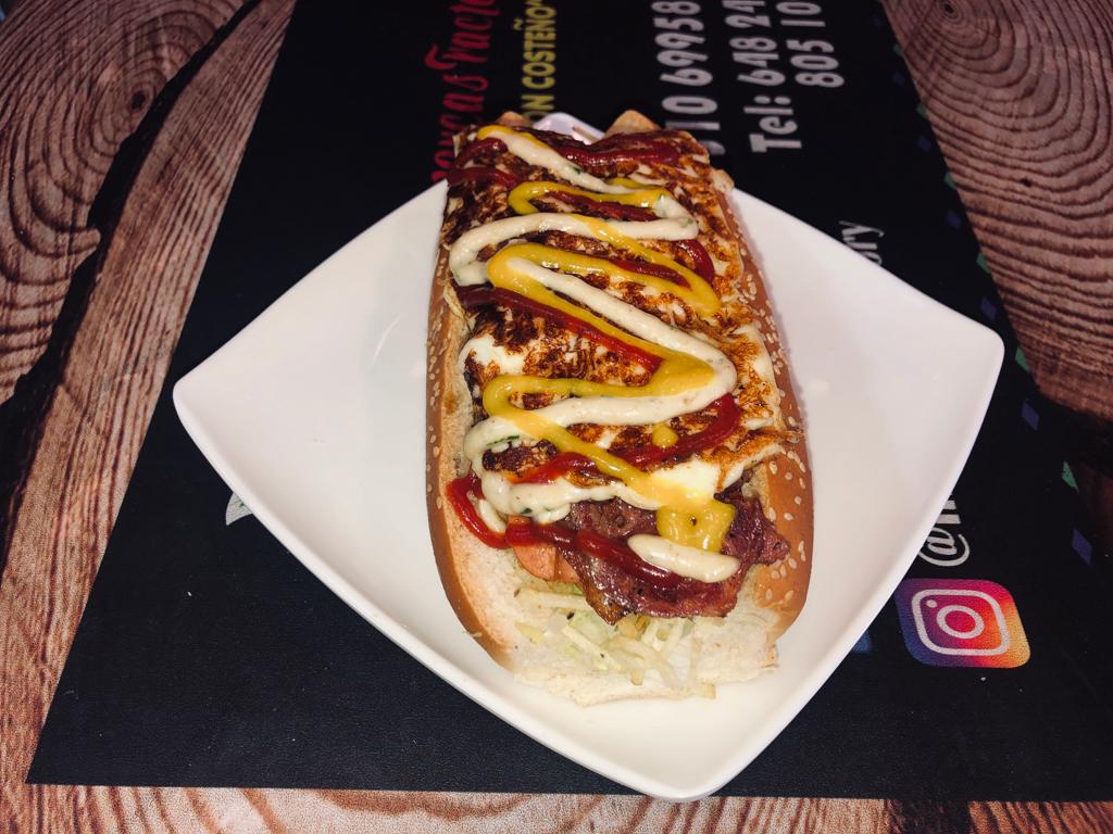Salchicha, pan perro, cebolla cabezona, salsa bbq, queso doble crema, cabello de angel, salsa de ajo y salsa de tomate.