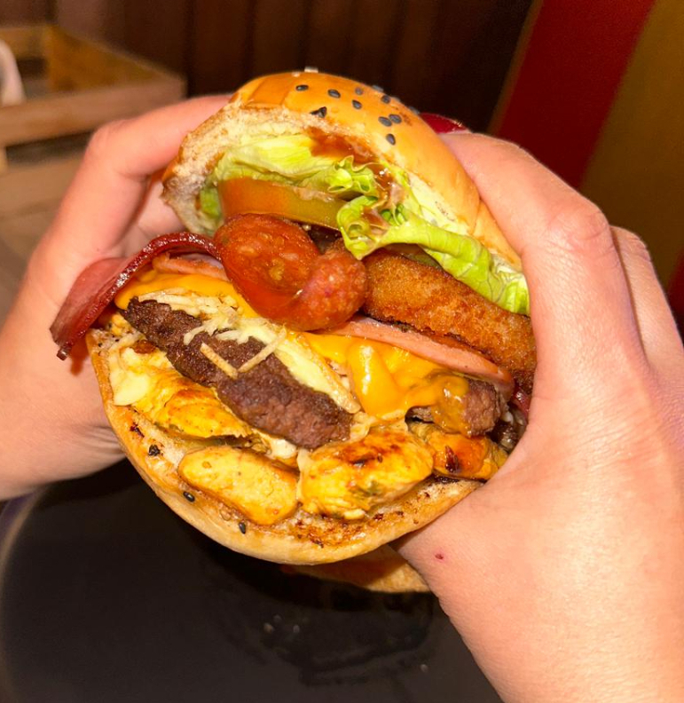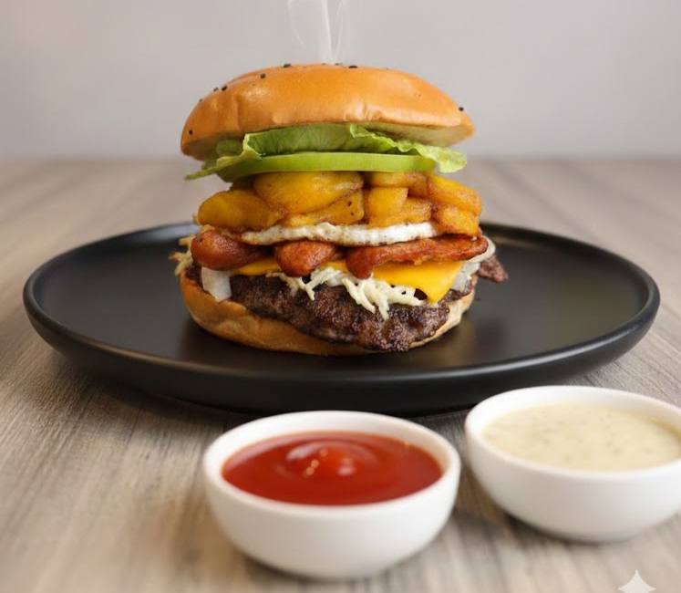 Hamburguesa montañera Carne de res artesanal, chorizo, huevo frito, maíz, maduritos, queso cheddar, vegetales frescos y salsas