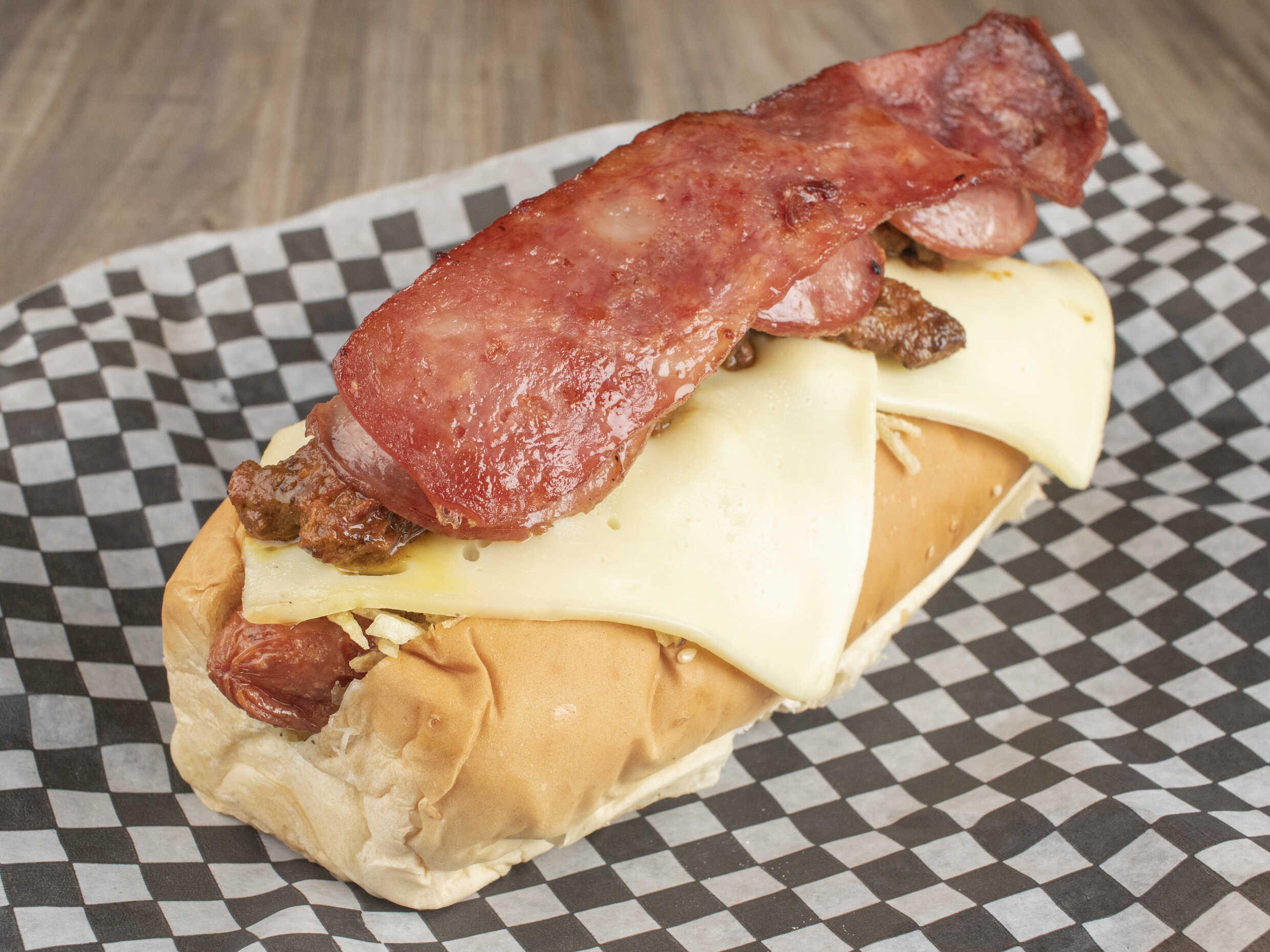 Mix de carnes, salchicha americana, lechuga, cebolla, queso gratinada, papa chips, cebolla crispy y salsas de la casa