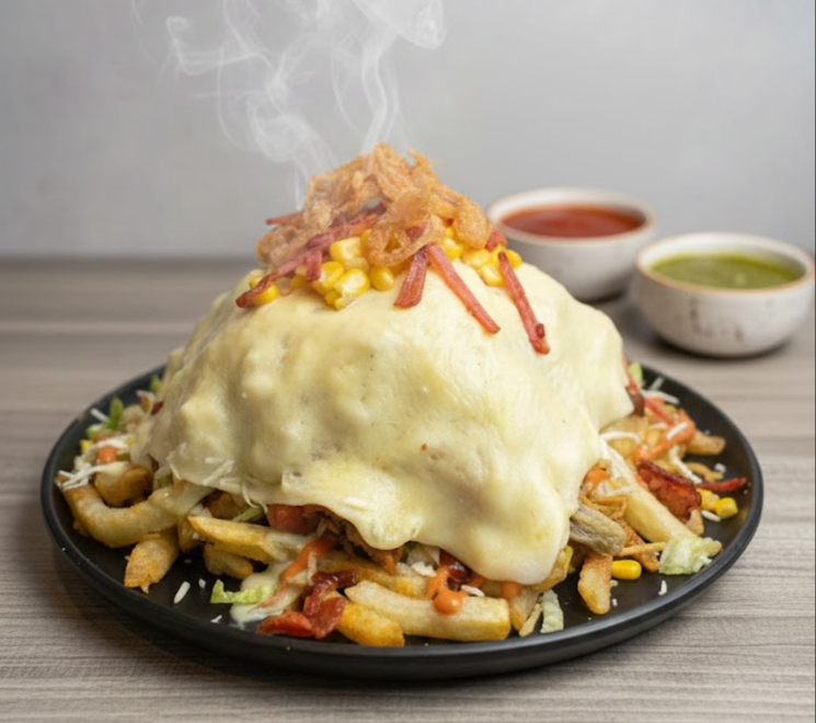 Mix de carnes,butifarra o chorizo,tocineta,maíz,Vegetales ( opcionales) , queso rallado,papas chips