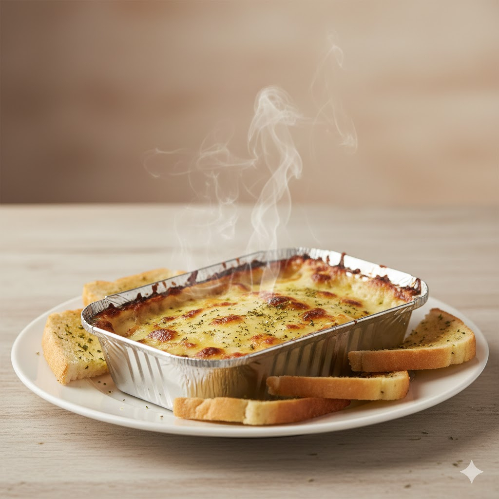 pasta lasagna, Mix de carnes , champiñon ,queso gratinado, queso parmesano, maíz y acompañada de pan tostado con mantequilla y especias