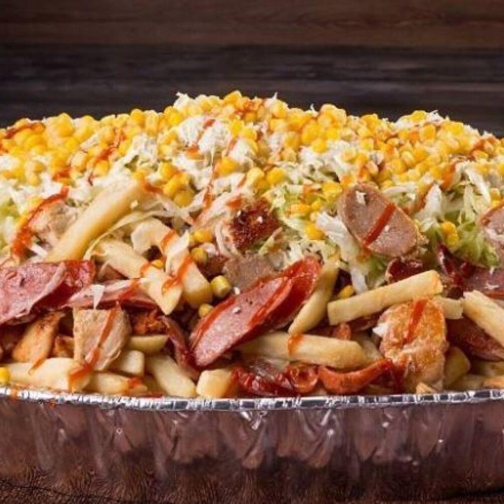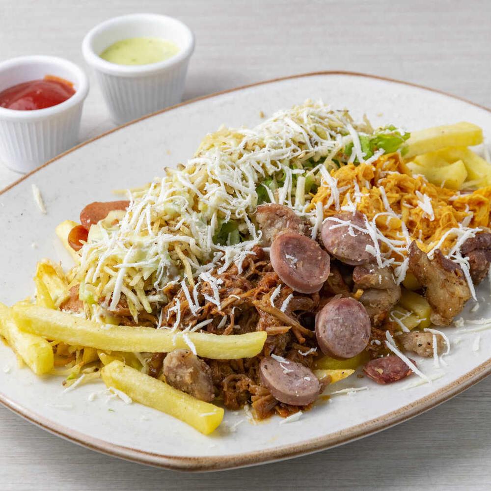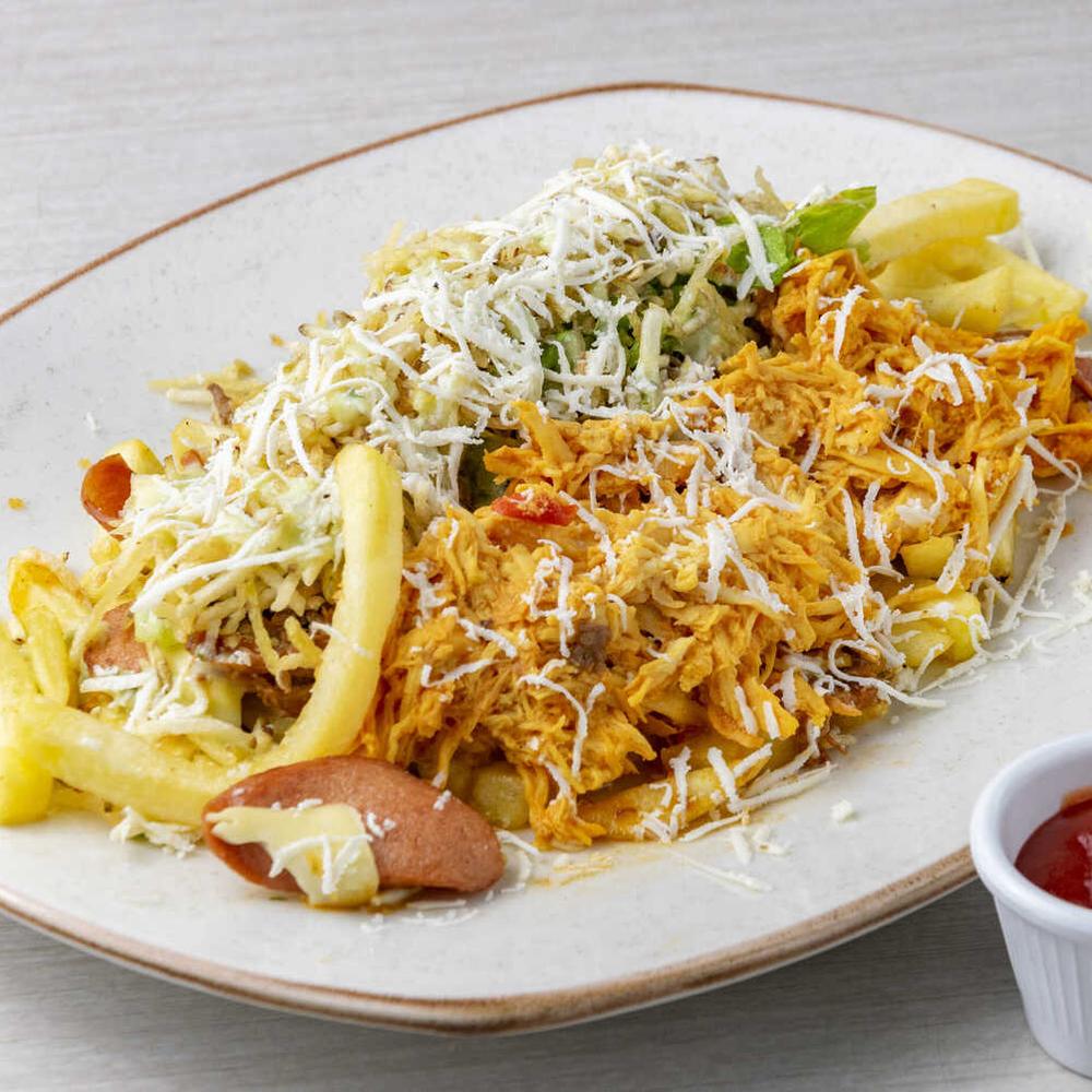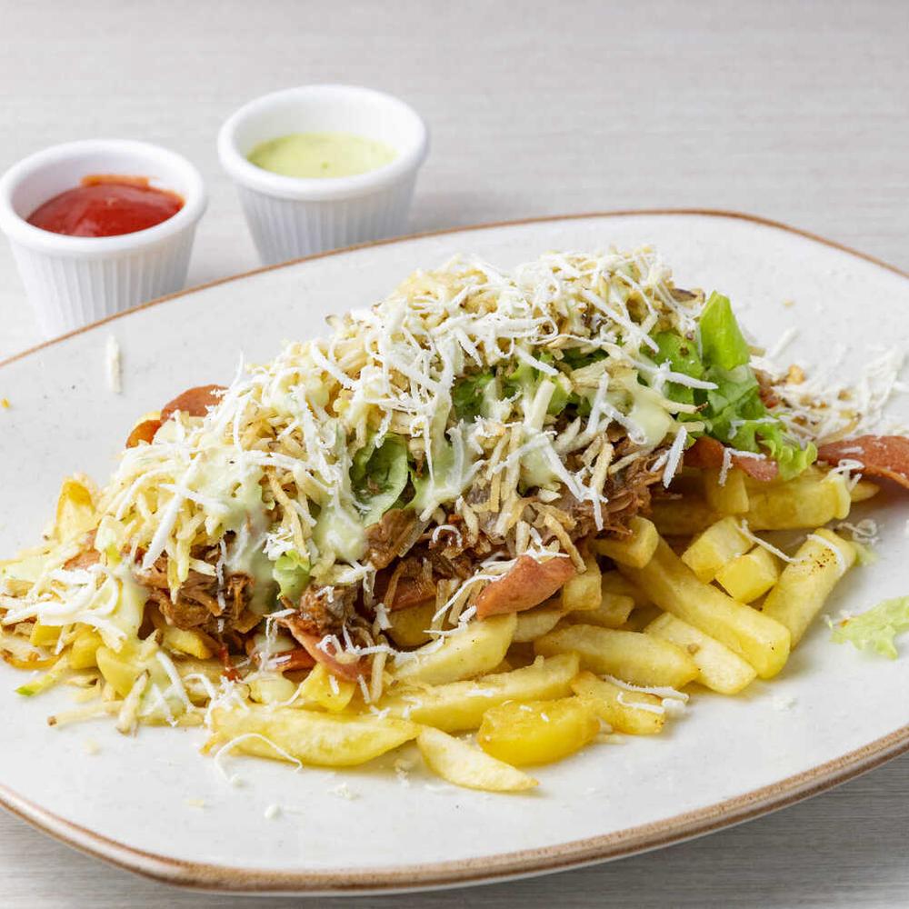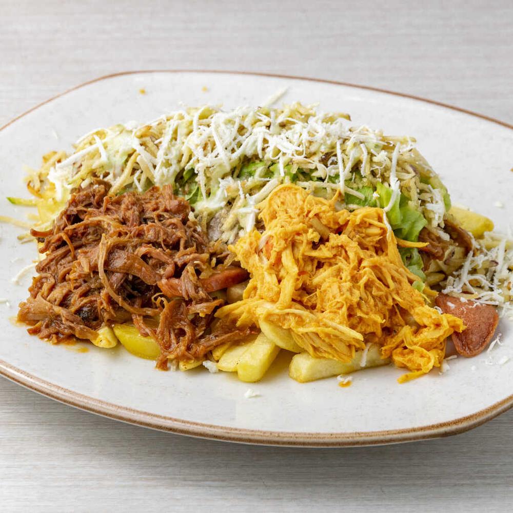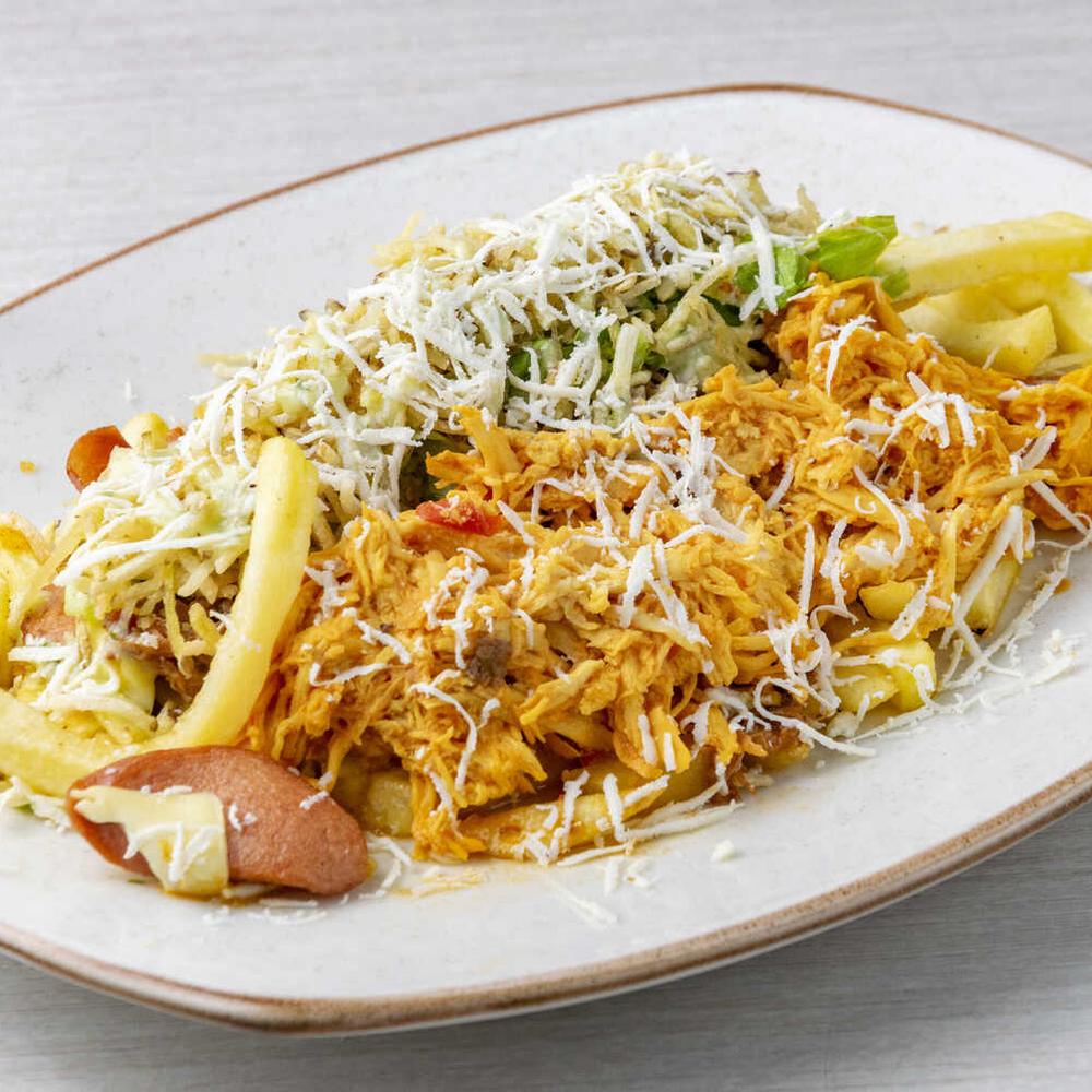 Papas a la francesa, salchicha americana, queso doble crema, carne y pollo desmechado, trocitos de chicharrón, trocitos de chorizo, lechuga, papitas fósforo, queso costeño, salsas