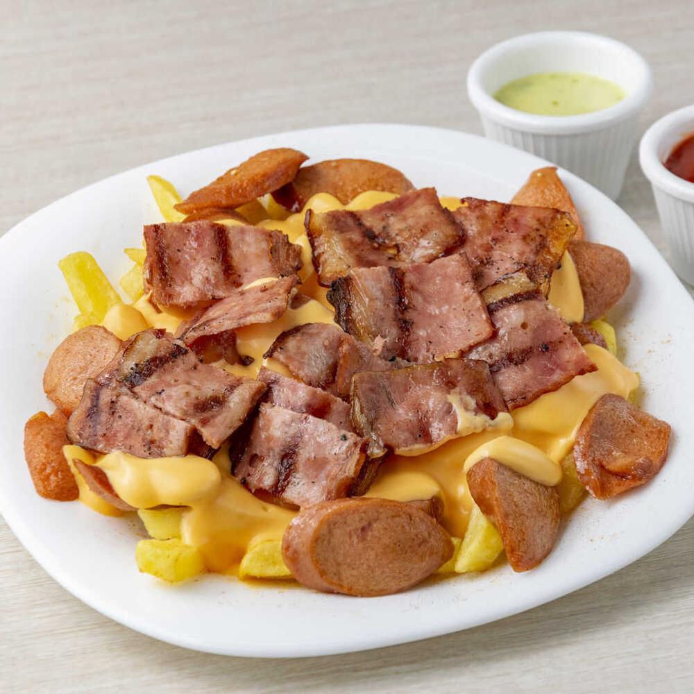 Papas a la francesa, salchicha americana, salsa de queso chédar y tocineta.