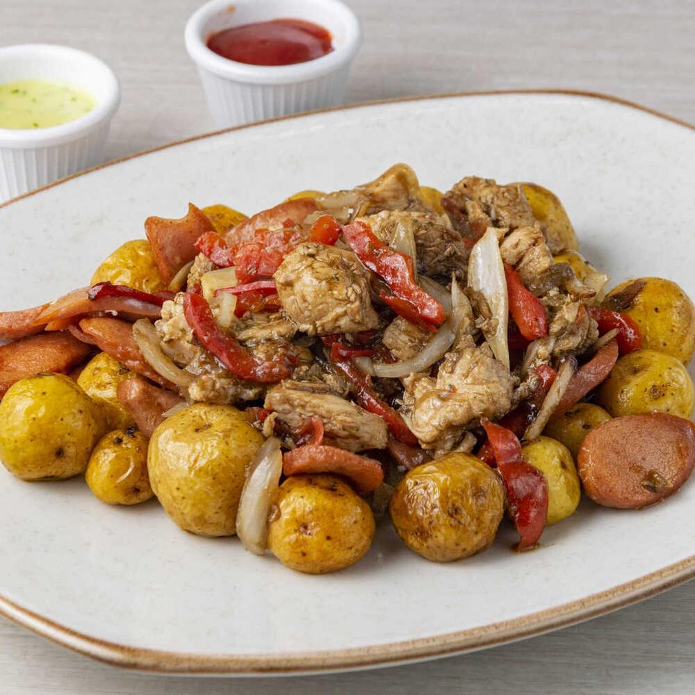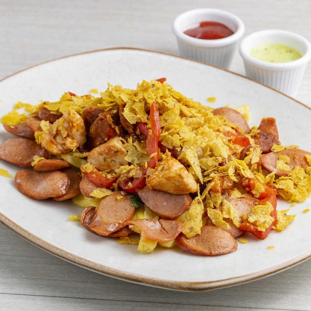 Cubos de pollo, julianas de res, chorizo, julianas de pimentón y cebolla salteado en salsa mexicana picante, papas a la francesa, salchicha americana, tostacos.