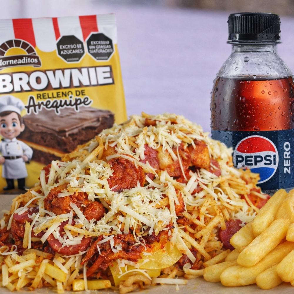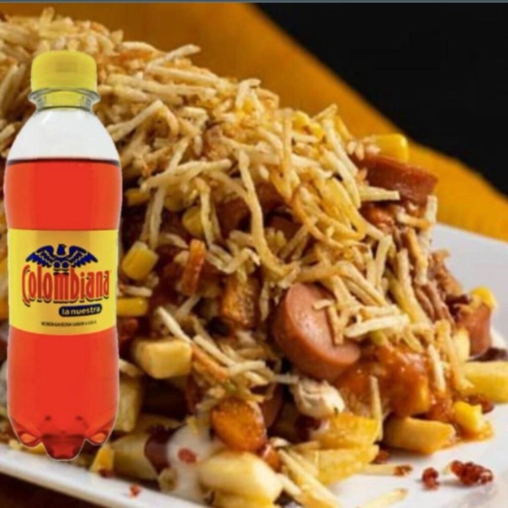 Papas a la francesa, salchicha americana, queso doble crema, carne y pollo desmechado, trocitos de chicharrón, trocitos de chorizo, lechuga y papitas fósforo mas una gaseosa litro.