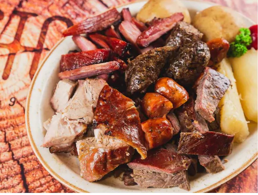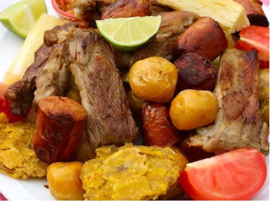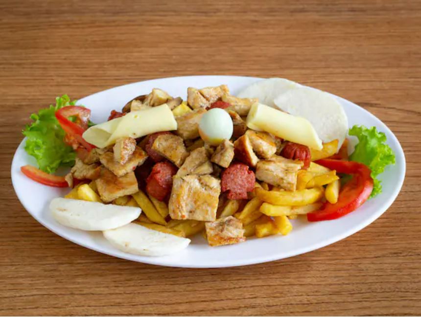 Jugosa picada de tres carnes: cerdo, res, pollo, con papa francesa o papa criolla, yuca, chorizo y arepa.
