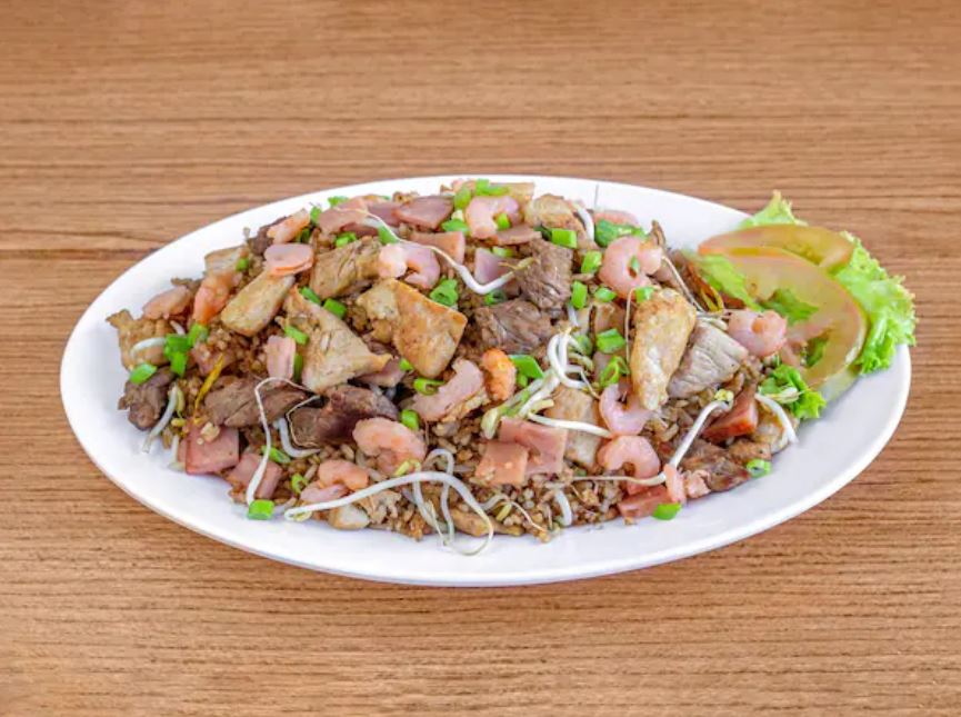 Arroz al wok con delicioso pollo, cerdo, jamón, raíces chinas, camarones.