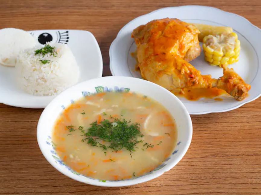 Acompañado de arroz blanco con porción de papas a la francesa o yuca + Ensalada.