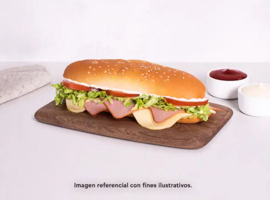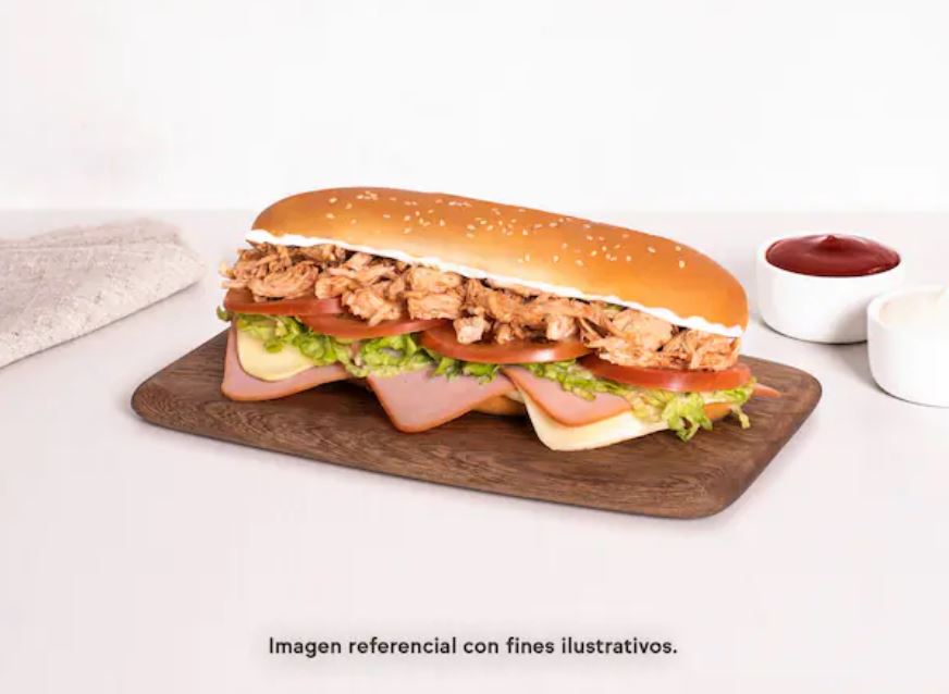 Delicioso sándwich de jamón ahumado, filete de pollo: con vegetales frescos, queso, papa chip, tomate, mayonesa, mostaza, piña. Acompañado de papa a la francesa + gaseosa personal 250 ml.