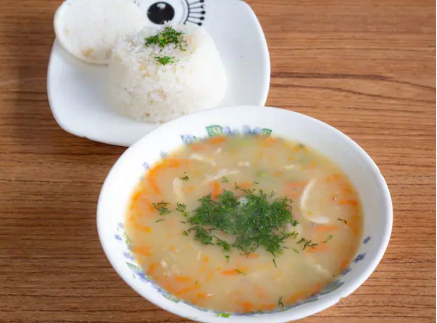 Deliciosa sopita de pollo casera, acompañada de arroz y arepa.