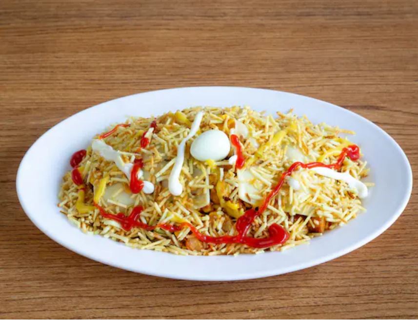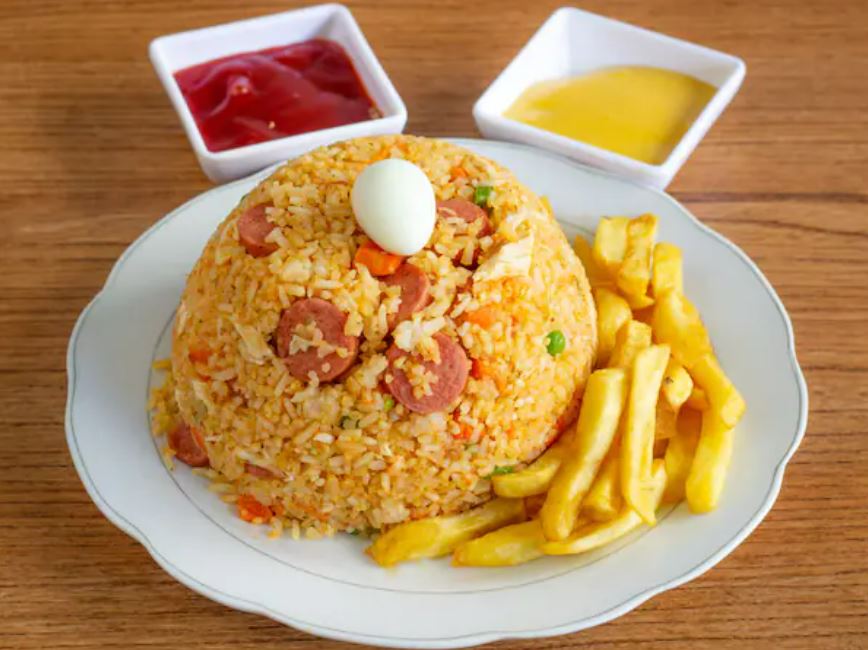 Arroz al wok con delicioso pollo, cerdo, jamón, raíces chinas, camarones. Acompañado de papas a la francesa,