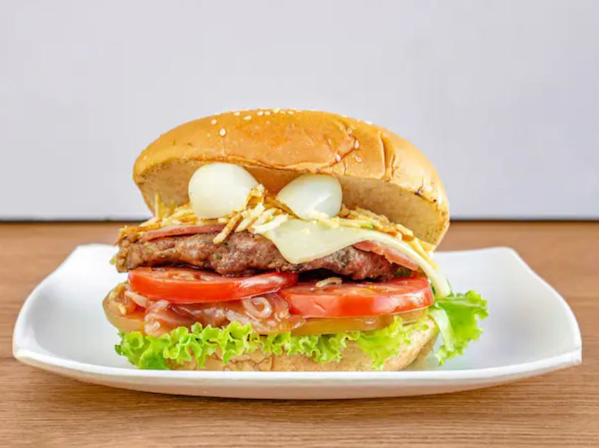 Deliciosa hamburguesa de carne artesanal con queso, jamón, vegetales, cebolla grille, huevo codorniz, papita chip con salsa mayonesa, tomate, mostaza y piña.