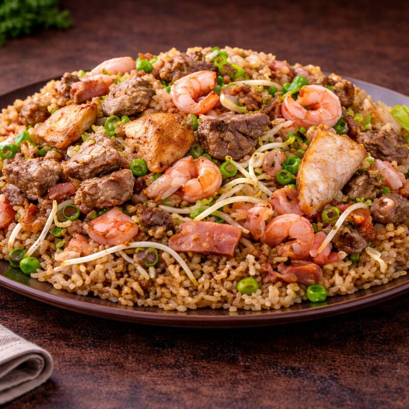 delicioso arroz al wok con torcitos de carne , raices chinas , jamon