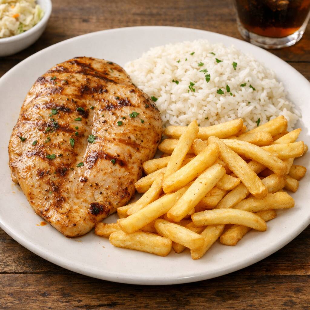 delicioso fillete de pollo con papa francesa , yuca o criolla con arroz blanco