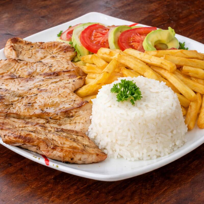 delicioso lomo de cerdo con papa francesa , yuca o criolla con arroz blanco