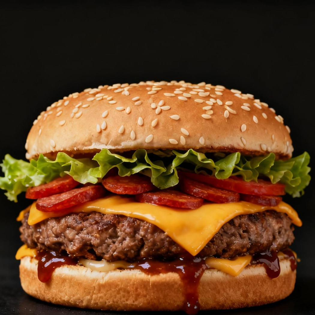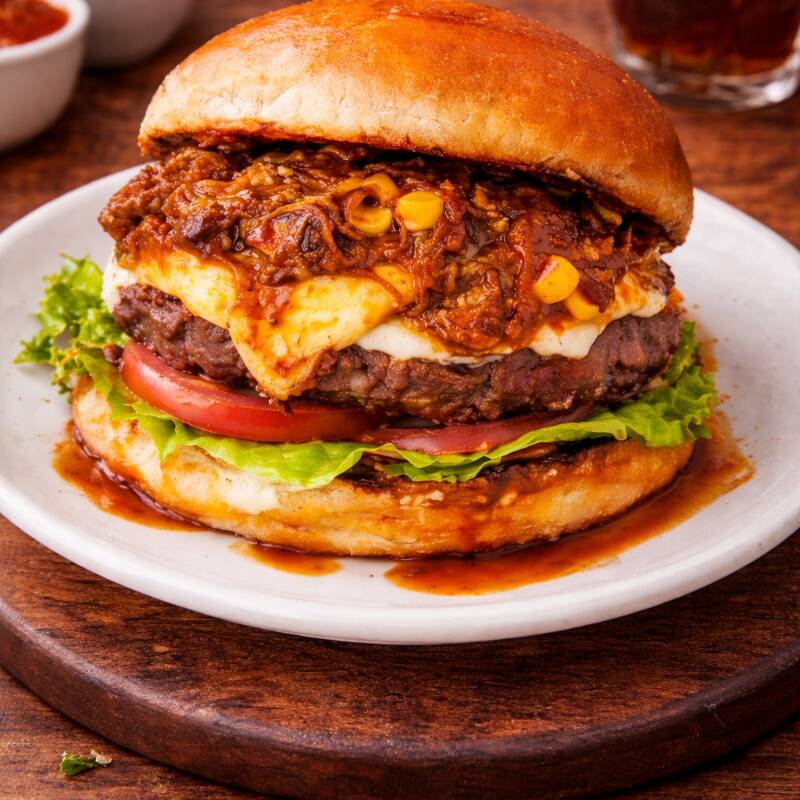 Carne de res (130gm) carne desmechada, queso americano, Maíz, Hamburguesas de 130gm, Tomate, Lechuga. Más gaseosa de 250 ml productos postobon disponibilidad de tienda.