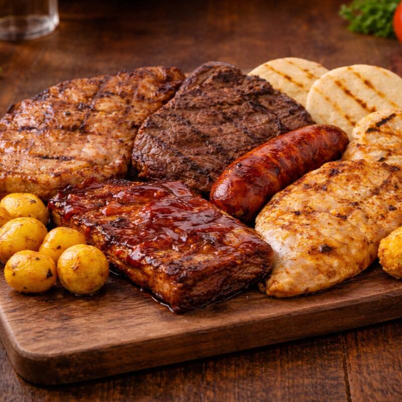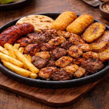 Deliciosa carne de res, carne de cerdo, pechuga, ( 100 gm cada uno )chorizo santa rosano, trozo costilla (50 gm) en salsa de BBQ, papa criolla, croqueta de yuca (1) arepa.