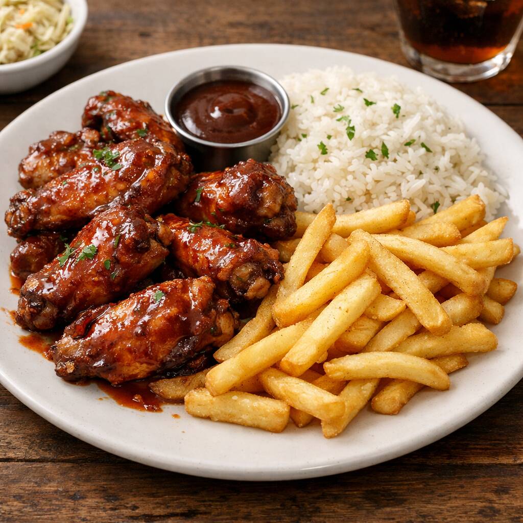 6 Alitas, 12 piezas crujientes, BBQ, acompañadas de porción de francesa yuca o criolla