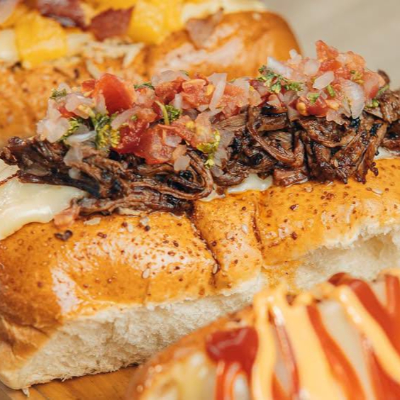 Delicioso combo de perro con salchicha americana, jamón y queso, pico e gallo, carne, picante y salsas